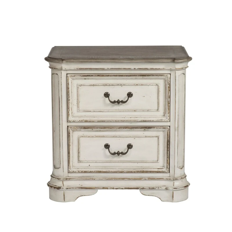 Opt for an elegant display. A refined yet relaxed feel describes the Magnolia Manor queen upholstered bed, dresser, mirror, chest, and nightstand. Crafted of poplar solids with white oak and birch veneers, this kit features an antique white finish with heavy artistic chipping and weathered brown with whitewash tops. The bed is upholstered in tufted chenille, laced with tone’s of white, tan and brown threading. The arched crowning and dog bone accents on each corner effortlessly add both definition and character, completing your look. The dresser and mirror duo are the perfect way to accent your room. Weathered brown whitewash tops paired with the antique white finish creates a truly unique look. Softness is added to the design with canted corners and rounded pilasters, accompanied by bead molding on each drawer front. The dresser, chest, and nightstand feature full extension drawer glides for easy access to storage, fully stained interior drawers, felt lined top drawers, framed drawer fronts, and dust proofed bottom drawers that are accented by antique pewter bail and knob hardware. Take advantage of the built-in charging station on the nightstand, complete with two electrical outlets and two USB ports. Warm antique finishes and artistic distressing along with grand scale creates a group to be passed to generations.