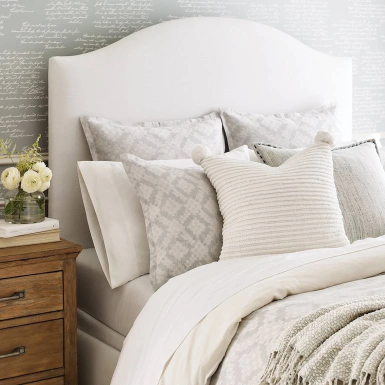 Let the Macie Complete Queen Bed with graceful curves and silhouette bring a flair of romanticism into your bedroom-at a great price without compromising on Bassett quality. The Macie bed features a tightly upholstered headboard for a soft, sleek look with tapered walnut legs and is available in all of our upholstery fabrics. Sold as a complete bed only with a low footboard in Twin, Full, Queen, King, and Cal King sizes. Nail head trim available in oiled bronze, antiqued brass, French brass, nickel, and chrome. Not designed to accommodate adjustable-base foundations. For more custom options, see the Vienna and Manhattan bed styles.