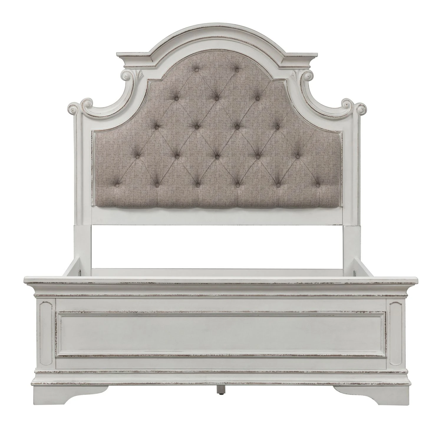 Accent your bedroom with the perfect blend of European Traditional design, using this unique upholstered bed. Crafted of poplar solids and birch veneers, this piece features tufted chenille upholstery, laced with tones of white, tan and brown threading, an antiqued white finish with heavy chipping, bead molding, bolt on rails, and a center support slat system, ensuring sturdiness. The arched crowning and dog bone accents on each corner effortlessly add both definition and character, completing your look.