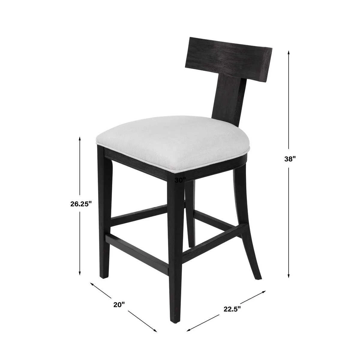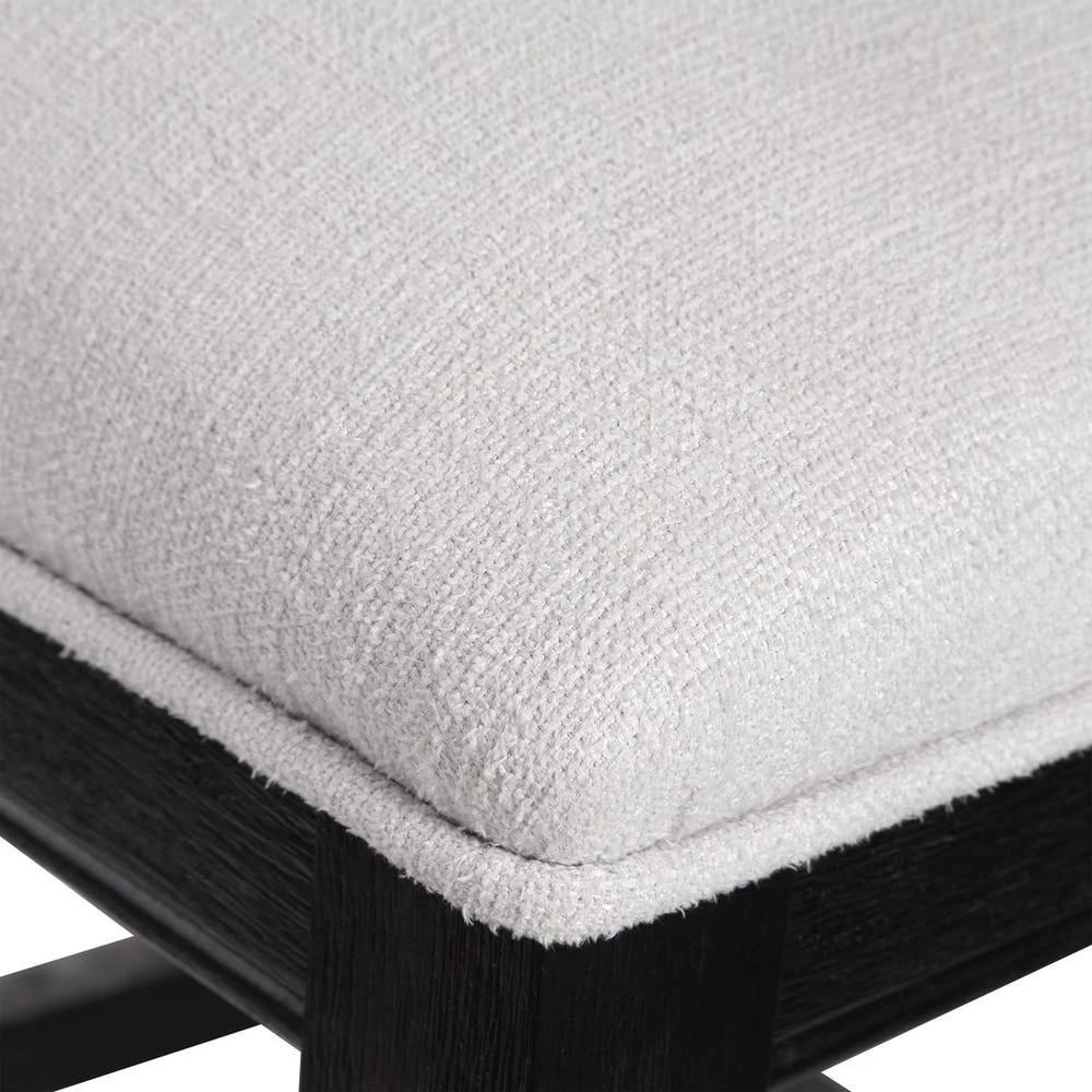 This modern take on a klismos chair features a curved rubber wood frame that has been wire brushed and rubbed in a charcoal black stain, paired with a stone white slubbed performance fabric cushion.