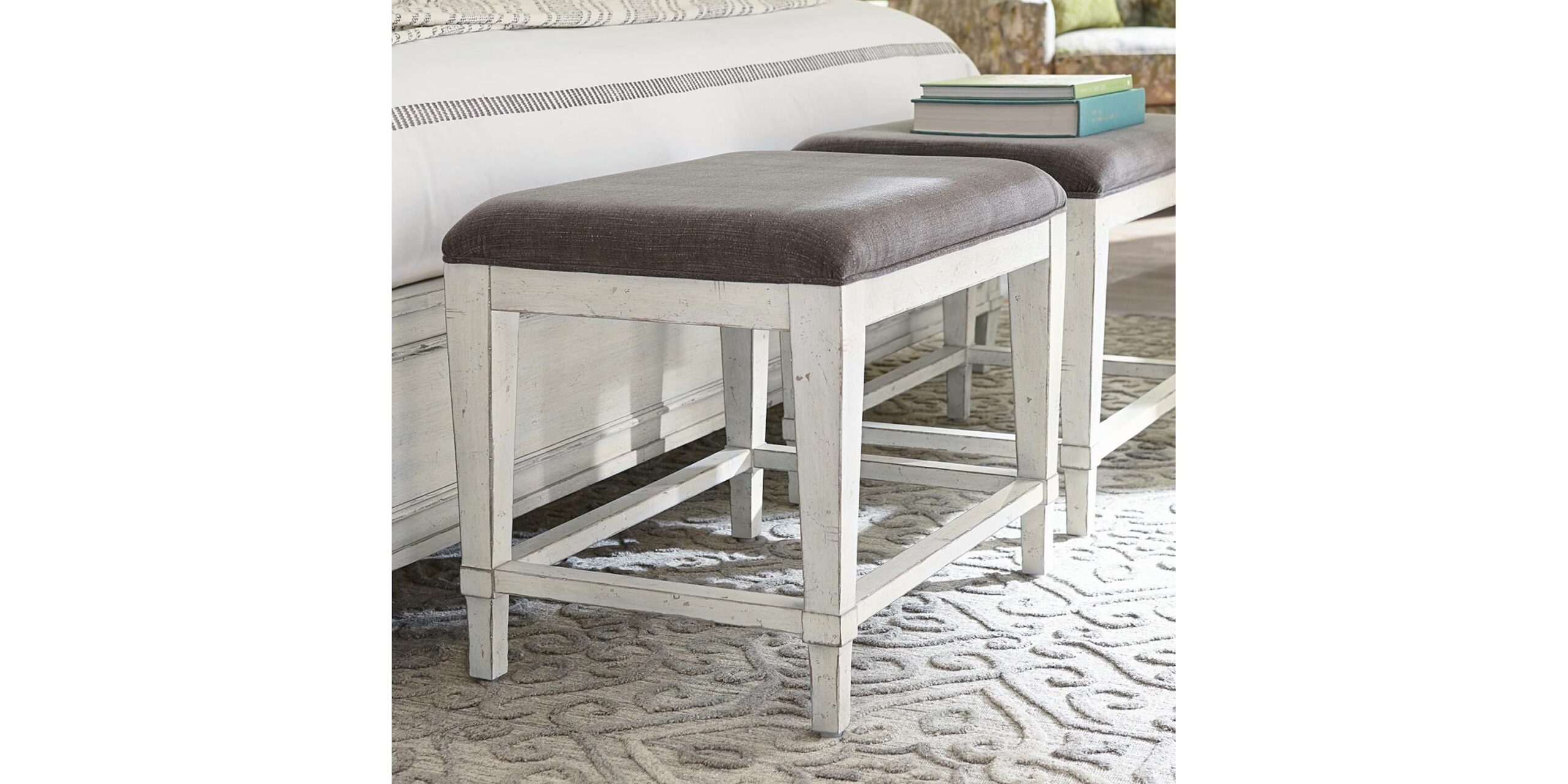 Rest easy for a moment. The solid birch Bella Bench, with its multi-step Aged Whitestone chip-away finish, radiates old-world charm, with a finish that gives both a hand-crafted effect and the appearance of age. The comfortable seat is upholstered in a calming dove grey heathered linen blend.Bassett Furniture’s extensive Bella collection faithfully recreates the look of prized antiques for the romantic upholstered panel bed, wood panel bed, dressers, chest, nightstand, bedside table, and mirror. Eclectic Aged Whitestone chip-away finish, worn pewter-finished bar pulls, and all-over wire-brushed warm gray finish tell the whole bedtime story. The textured stone top option is available on dressers and nightstands. Case pieces feature self-closing drawer guides.
