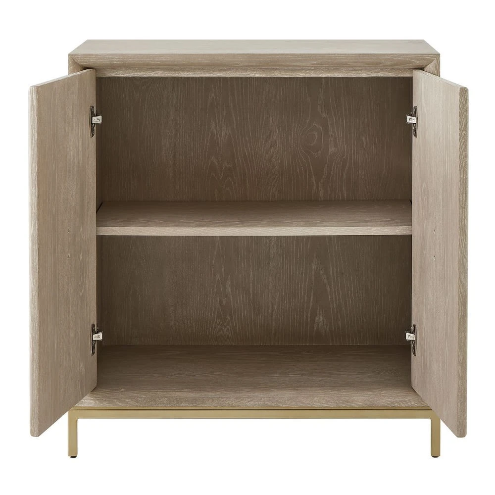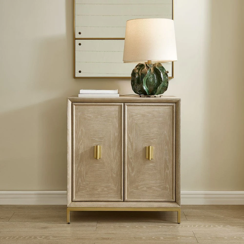 Showcasing a fresh contemporary look, the Alessia accent chest exhibits a light oak veneer and solids adding a touch of brightness to any room. Its stylish appeal is elevated with brushed brass plated stainless steel hardware and legs, with four soft closing drawers.