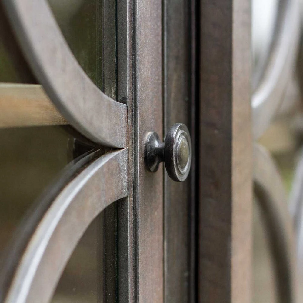 Craftsman built with breakfront styling, carved molding details, and elegant Paris silver finish, a subtly metallic silver over a walnut finished fine wood grain with clear glass doors.
