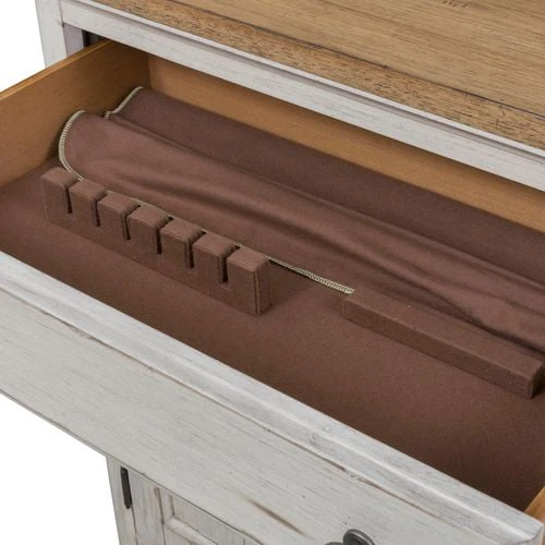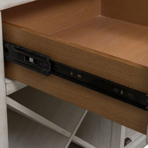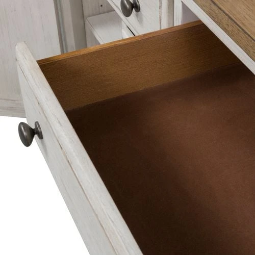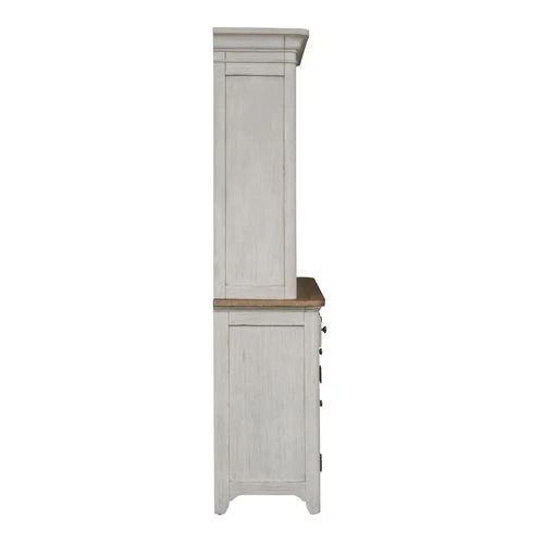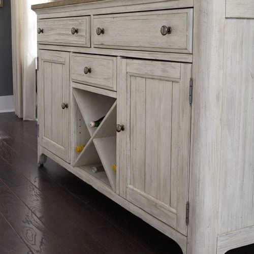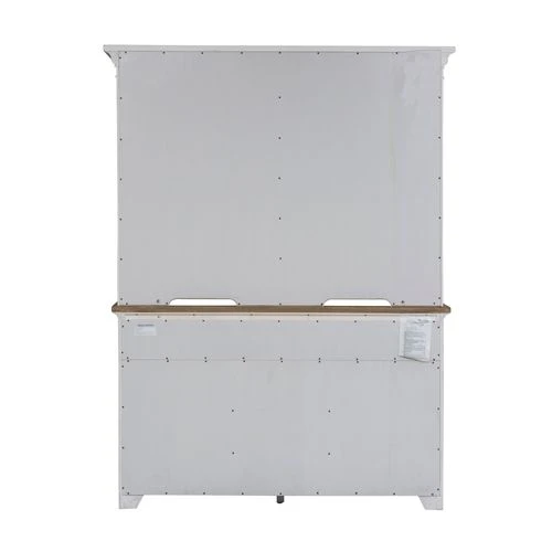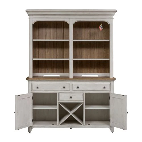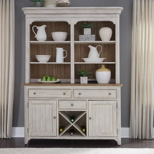 Enhance your dining space with a classic look and casual feel with the Farmhouse Reimagined hutch and buffet. Crafted of pine and poplar solids with hickory and pine veneers, this piece features a timeless antique white finish with a chestnut top and planked back panel, accented with heavy wire brush distressing. The two doors on the buffet are wood framed and planked. The buffet features three full extension drawers with chamfered fronts for easy access to storage, an adjustable shelf behind each door, a silverware tray, and removable wine storage, all accented by the antique brass knob hardware. The hutch features four adjustable shelves and wire management provisions. This piece offers a look that compliments today’s homes with style uncompromised.