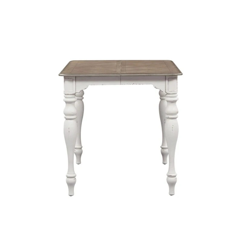 Gather in style with the Magnolia Manor gathering table. Crafted of poplar solids with white oak and birch veneers, this piece features the perfect blend of European design, one 18″ removeable leaf to easily accommodate guests or a large family, fancy face top finished in a weathered brown with whitewash, softly rounded corners, and is anchored by heavy turned legs. Warm antique finishes and artistic distressing along with grand scale create a piece to be passed to generations.