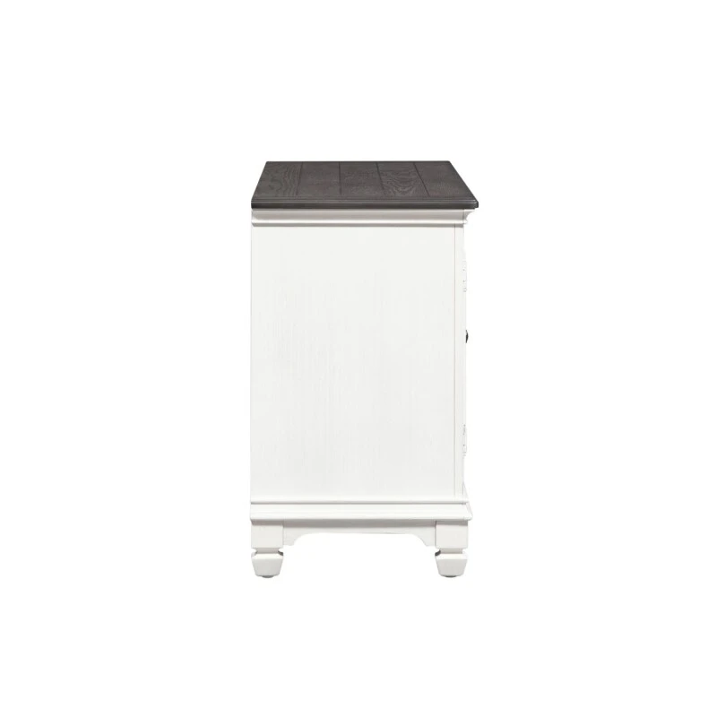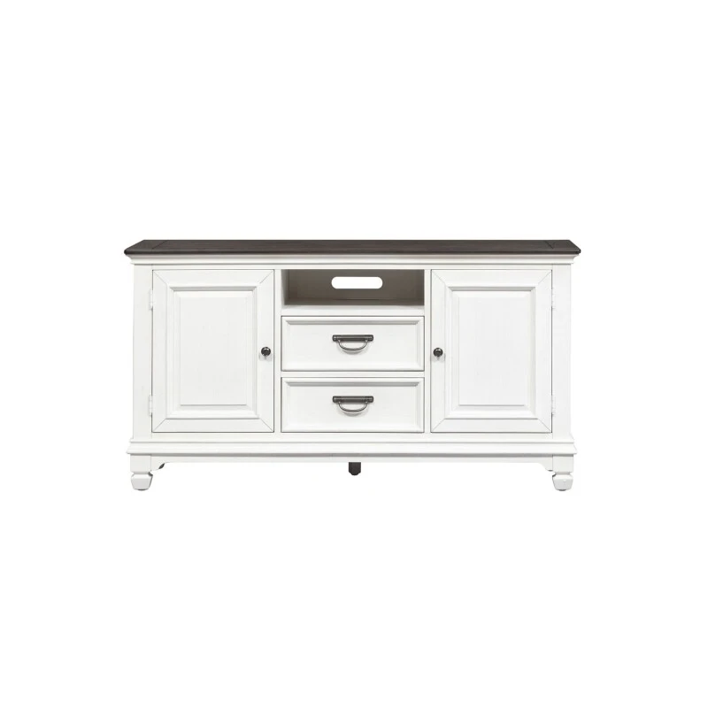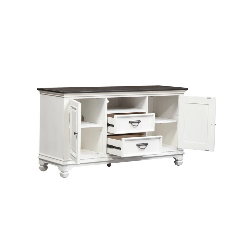 Indulge in a classic look and casual feel with the Allyson Park 56″ TV console. Crafted with pine solids and veneers with cathedral white oak veneer top, this piece can accommodate most 62″ TVs and features a wire brushed white finish with charcoal planked tops, full extensions drawer glides for easy access to storage, antiqued pewter knob hardware, fully stained interior drawers, square tapered feet and 1 adjustable shelf behind each door. The open compartment and wire management provisions effortlessly accommodate electronics or gaming equipment.