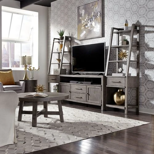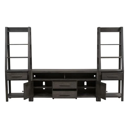Accent your living room with the perfect farmhouse design, using this unique and stylish entertainment center with piers. Crafted with poplar solids with knotty white oak veneers, this piece features sound bar and component storage, leaning piers, planked tops and is accented by washed brass elongated bar pull hardware with rounded ends. Wire management provisions accommodate a DVD player or gaming console of choice. The all-over dusty charcoal finish accompanied by heavy distressing sets this piece apart from the rest of the collections.