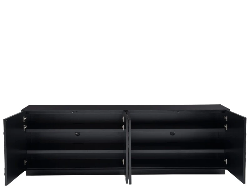 The Cosmo Credenza, crafted in Pyrite and finished in Matte Black, showcases a striking facade with its four doors, reminiscent of a sophisticated mosaic. This piece exudes confidence through its bold hues and defined silhouette, making it a statement of artistry and elegance in any space it adorns.
