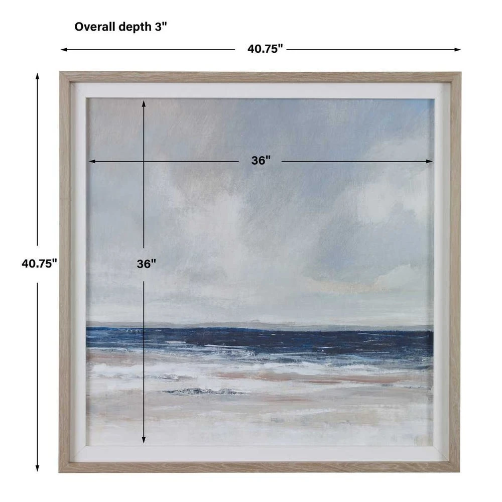 This transitional depiction of a coastal scene showcases a neutral gray and taupe color palette accented by deep cobalt blue. A natural linen inner liner and pine wood frame enhance this tranquil piece. Artwork by Tim O’Toole.