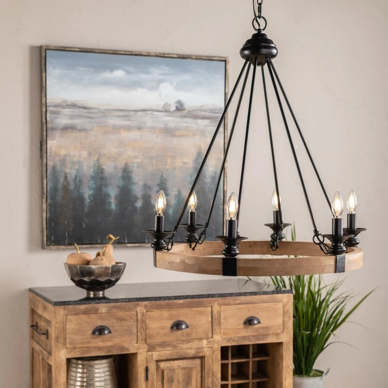 Fusing function with a farmhouse flair, this six-light Evolution by Crestview Collection Preston wood and metal chandelier illuminates any arrangement in style. Crafted from wood and metal in an antique finish, this fixture will cast a warm glow over any