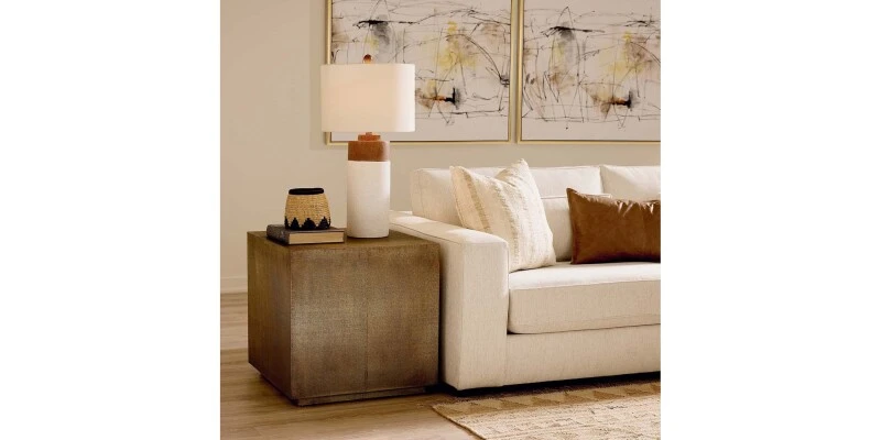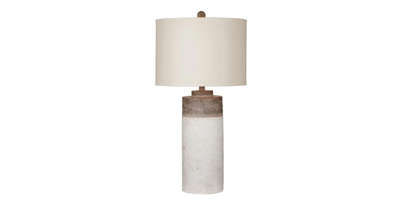 The white and beige color blocked, cement Malta Table Lamp provides an element of texture that makes any space feel more organic.