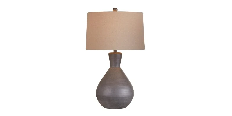 The Maura Table Lamp is crafted of cement in a dark grey finish with a beige, linen drum shade. The hand-crafted details produced by a skilled artist lend itself to unique characteristics and will vary slightly.