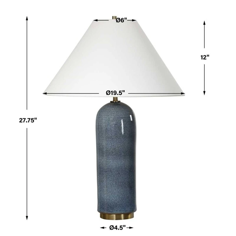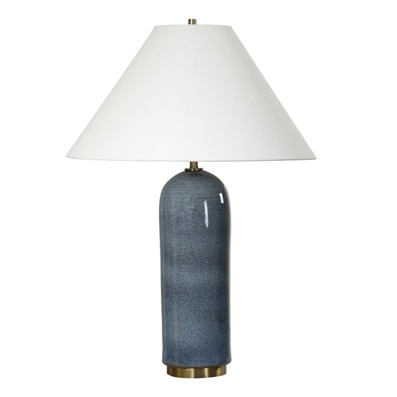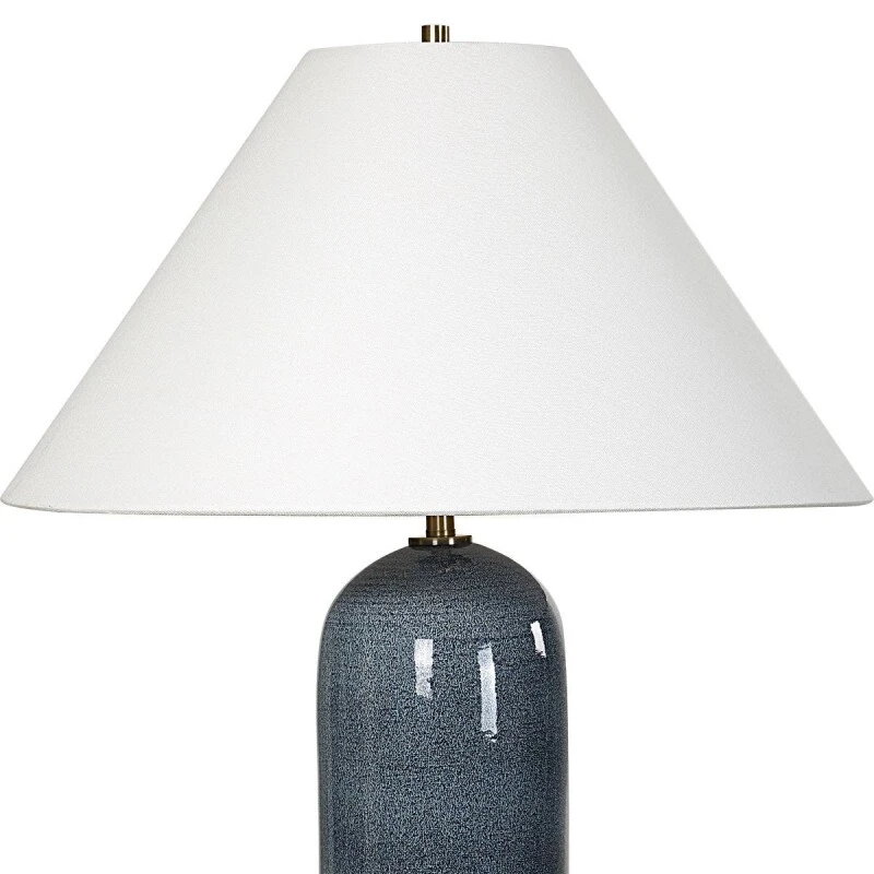 This hand spun ceramic table lamp boasts a stunning deep blue glaze with subtle textural undertones, beautifully complemented by plated antique brass accents. Due to the nature of fired glazes on this hand crafted ceramic lamp, finishes and size may vary slightly. The tapered round hardback shade is in a casual white linen fabric. Due to the nature of fired glazes on ceramic lamps, finishes may vary slightly.