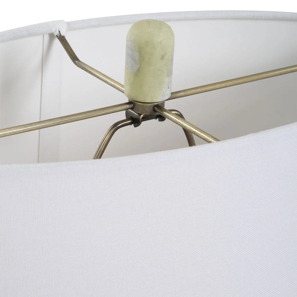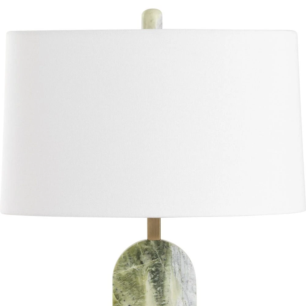 This exquisite table lamp showcases a green marble base with heavy white veining, accented with antique brass plated details. The natural beauty of the stone creates a truly unique and captivating piece. The round hardback drum shade is covered in a crisp white linen. True to the nature of natural materials, each piece will have unique marbling and veining throughout.