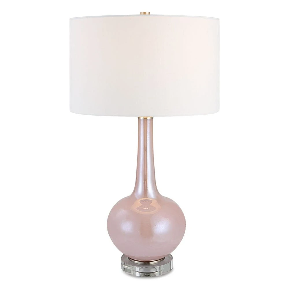 Elegant and sophisticated, the Rosa Table Lamp showcases a light blush pink glass base with brushed nickel and crystal details. The hardback drum shade is covered in a white cotton fabric.