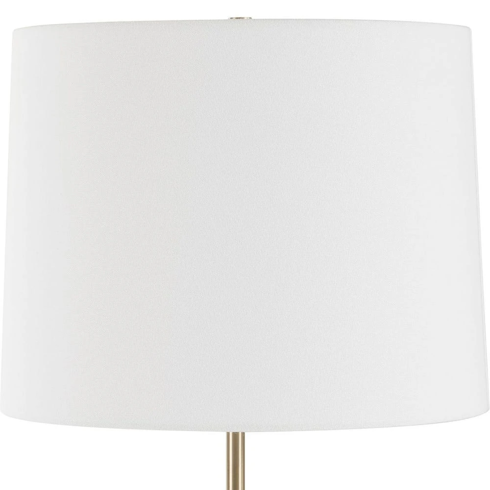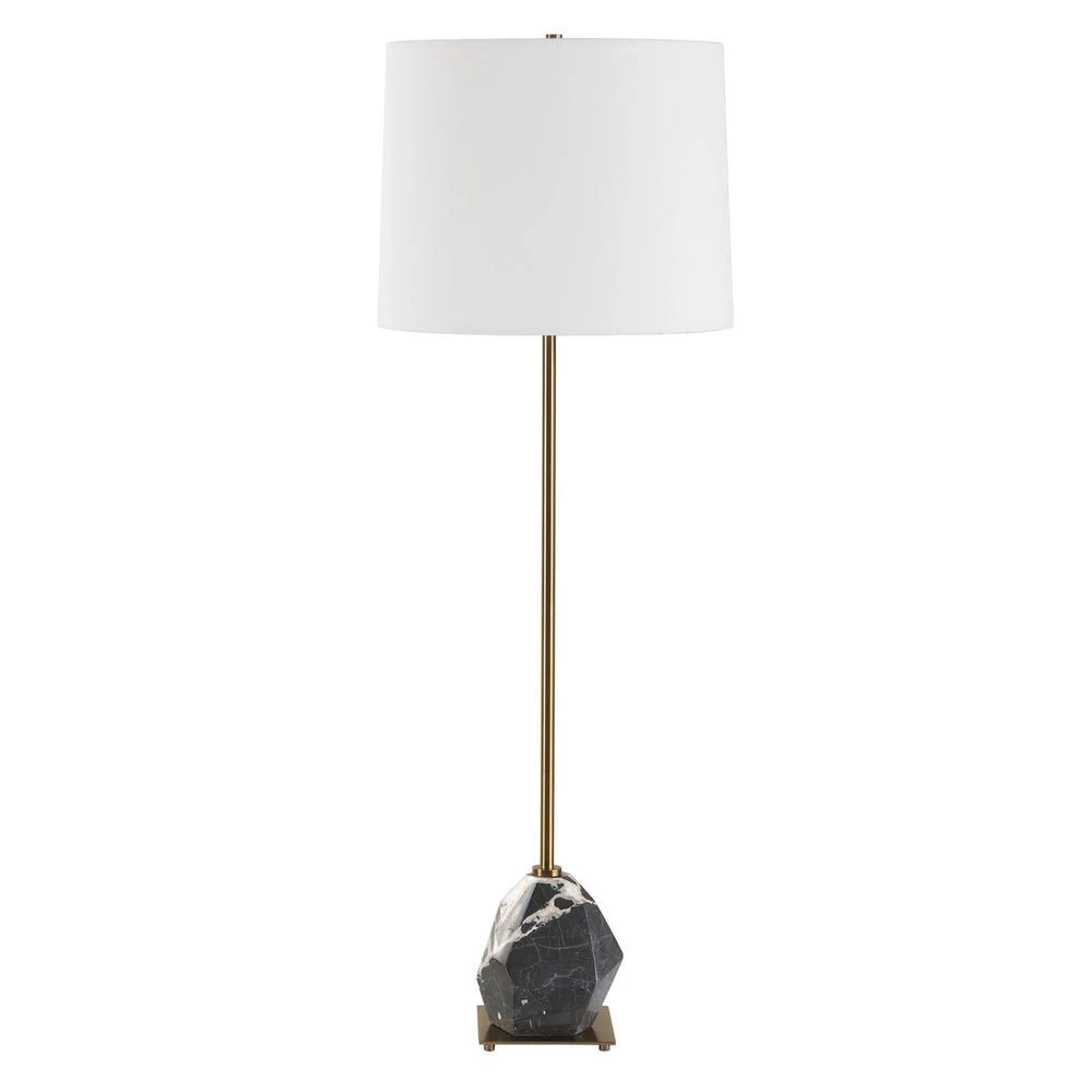 This tall buffet lamp features an asymmetrical, faceted black and white Panda marble base. The natural beauty of the stone is accentuated by antique brass plated details, resulting in a piece that is both artistic and functional. The slightly tapered round hardback shade is covered in a crisp white linen fabric. True to the nature of natural materials, each piece will have unique marbling and veining throughout.