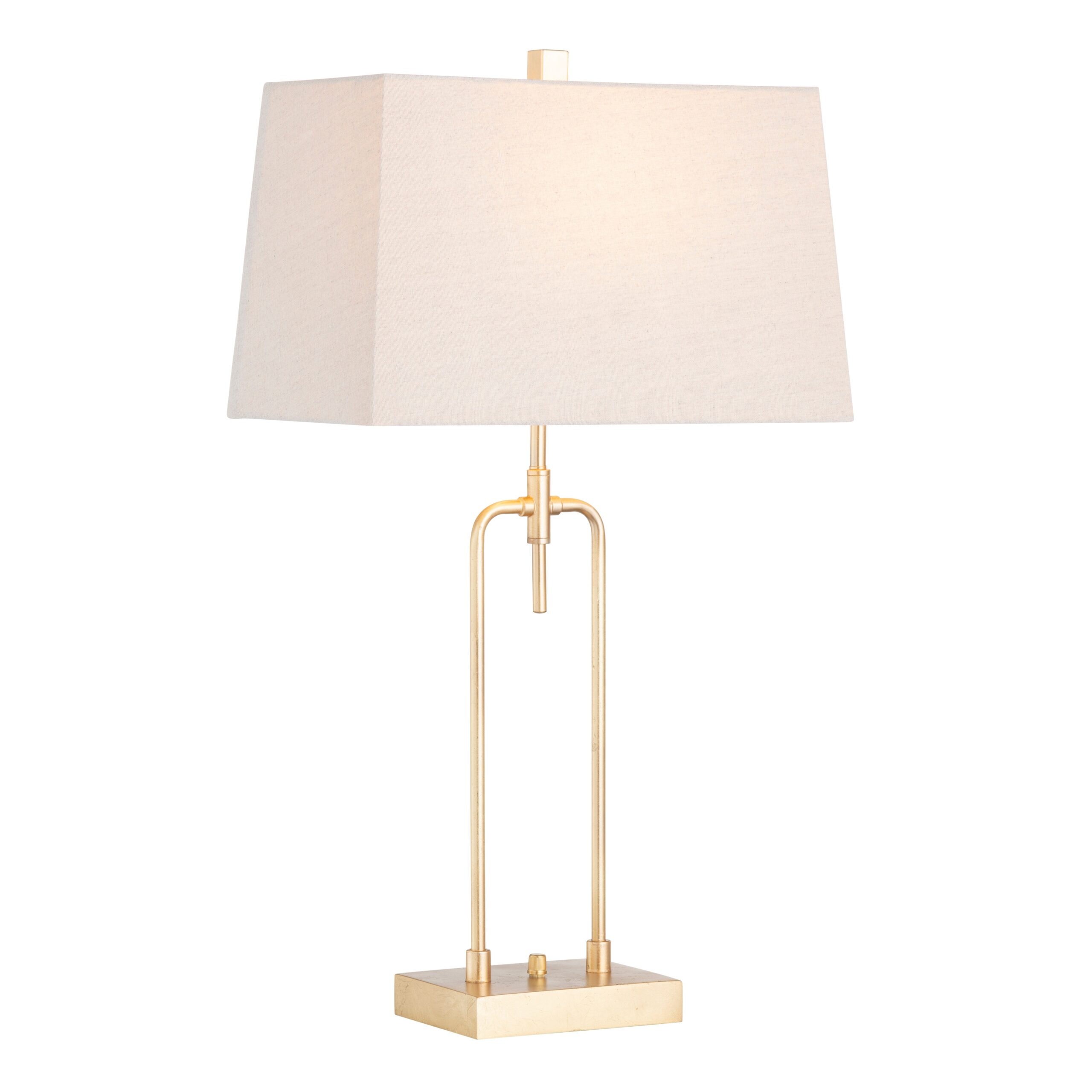 The simplicity of the Salinas Table Lamp by Crestview Collection makes it the perfect addition to any transitional decor. The bent metal creates a contemporary arch and is enhanced by its gilded gold finish. It is topped with a tapered, rectangular linen