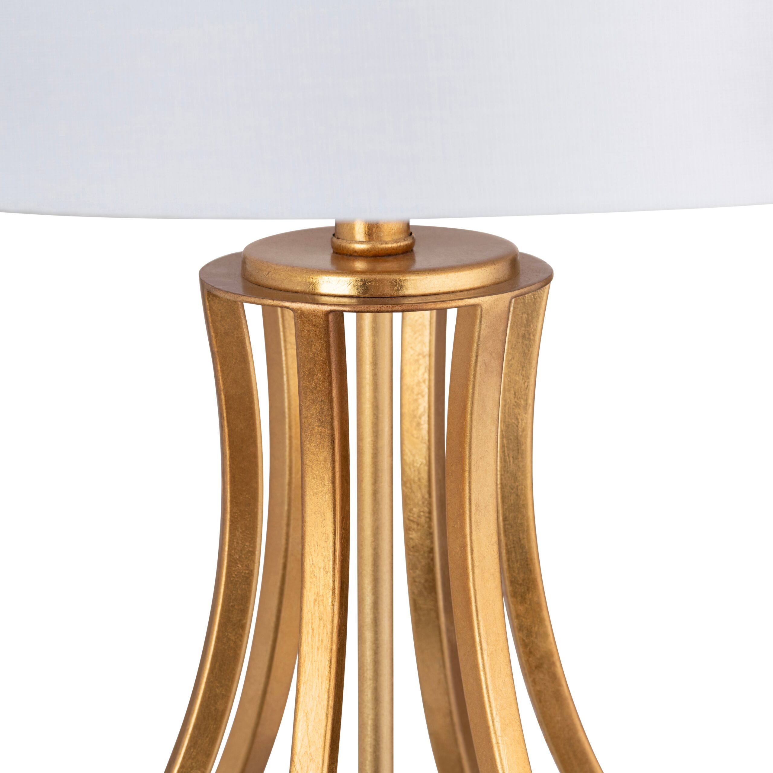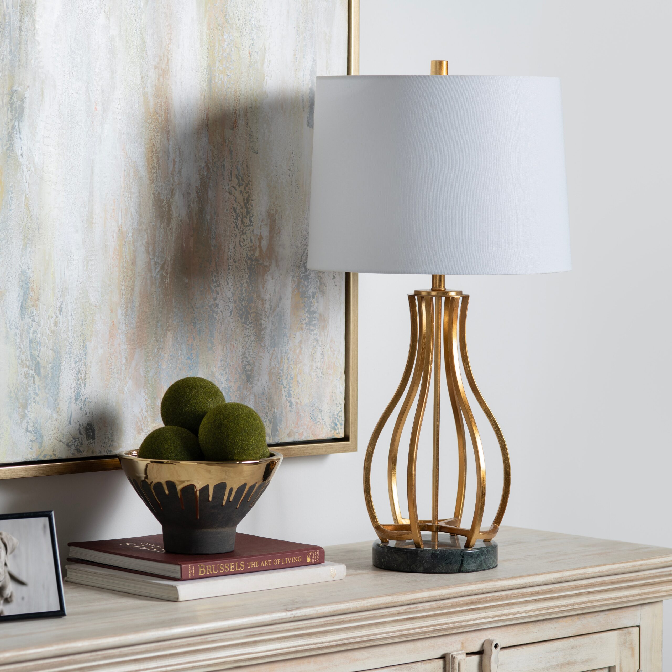 The Crestview Collection Streeter Table Lamp features an elegant open-cage metal design in a vase shape with a luxurious gilded gold finish. Resting on an emerald green marble base and topped with a white shade, this lamp brings a sophisticated, contempor