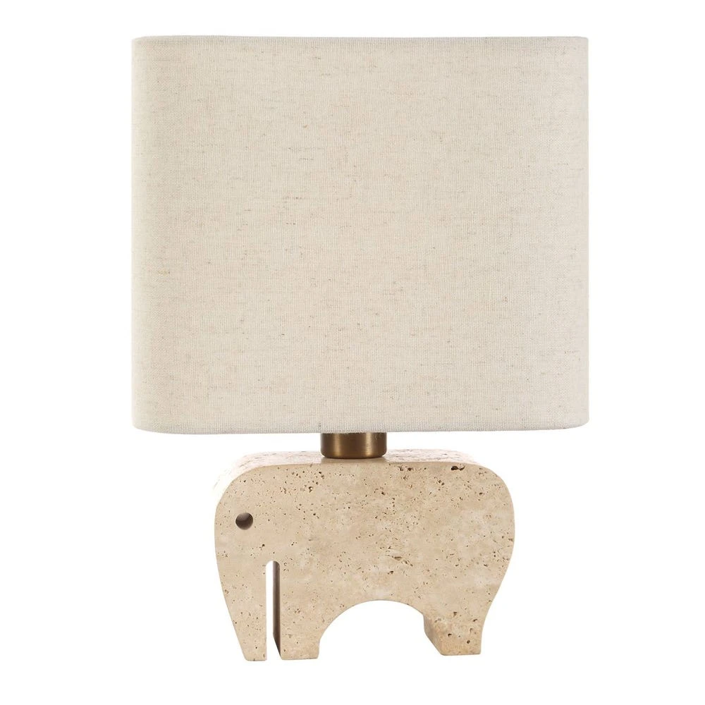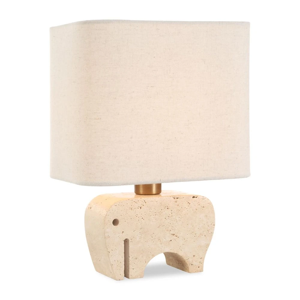 The petite Tusk Accent Lamp features a whimsical elephant sculpture carved out of beige travertine, accented with brass plated details. The rectangle hardback shade with curved corners is covered in a casual khaki fabric with natural slubbing. Perfect accent piece for kitchen counters, etageres, or anywhere that needs visual artistry.