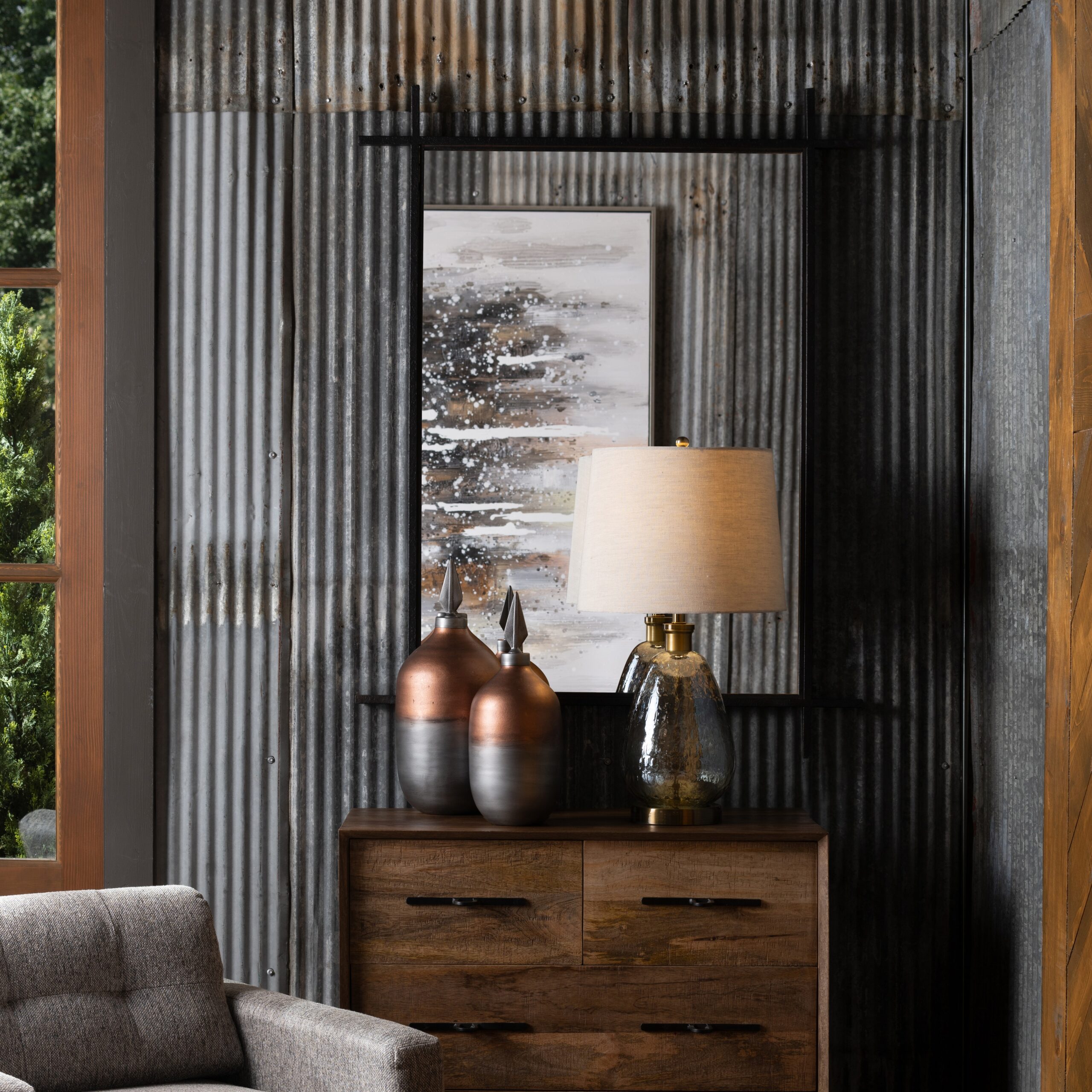 The Crestview Collection Pierce Mirror has a minimalistic design that will make a great accent piece anywhere in your home. An aged iron frame with a black finish completes this large, rectangular mirror. On each side of the mirror, the frame extends past