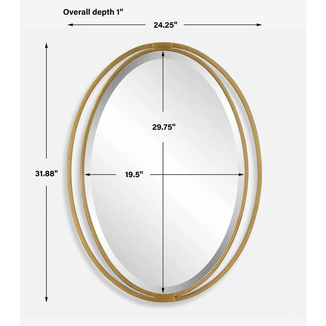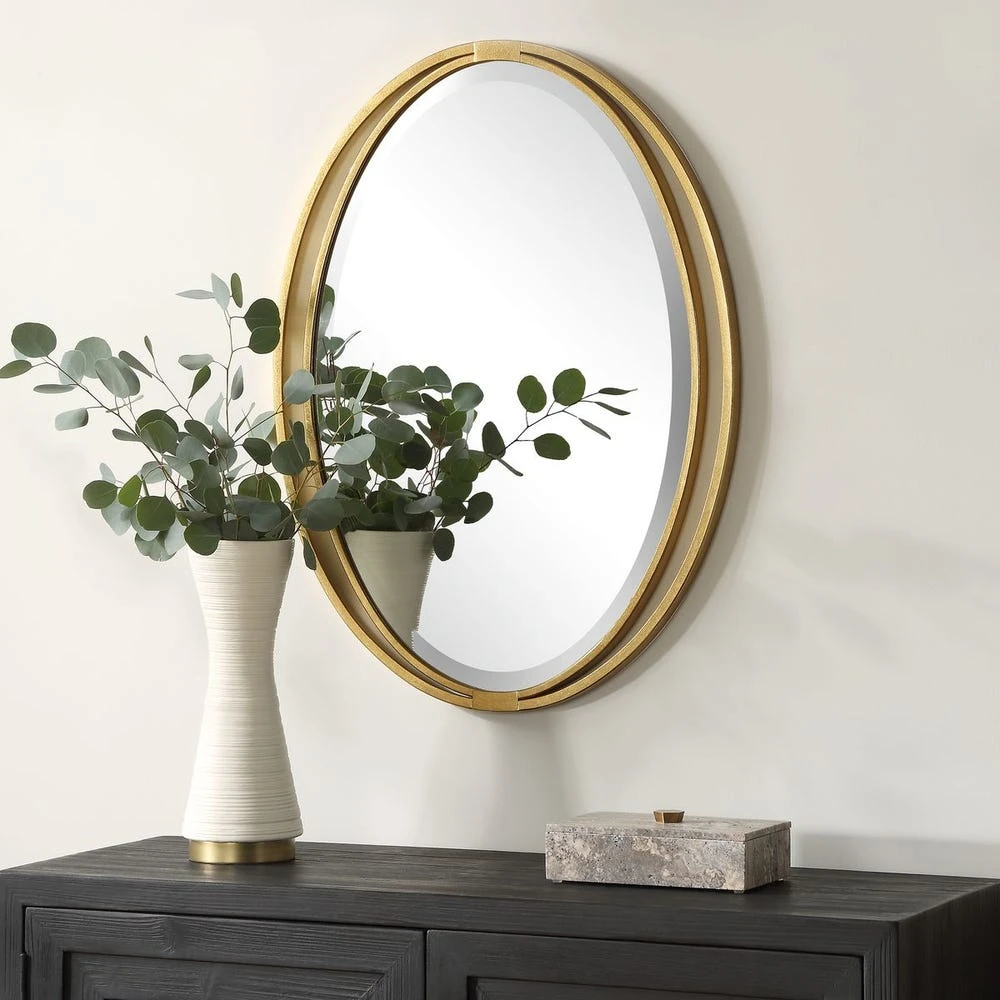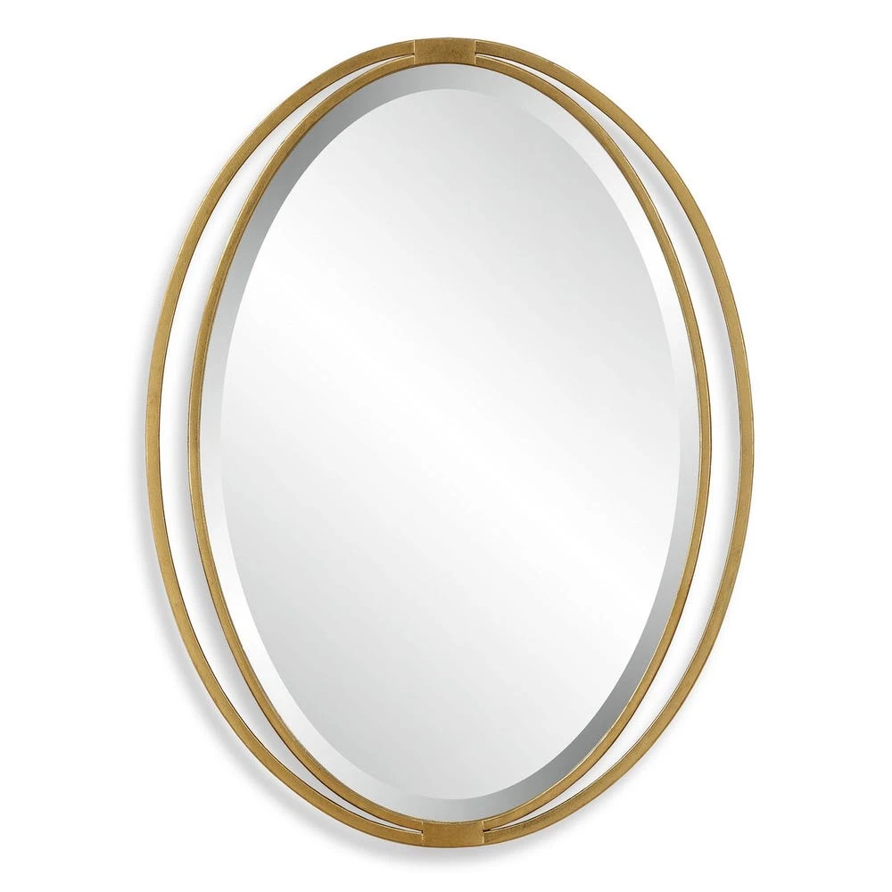 The Rhodes Oval Mirror features an oval outer iron frame surrounding an inner oval, finished in a antiqued metallic gold leaf, adding sophistication to any room.