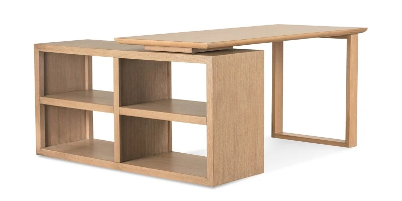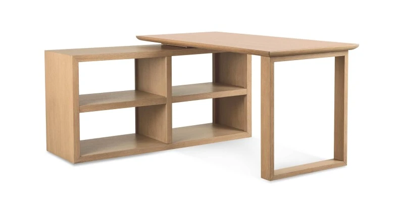 360° adaptability at a mere swivel is the promise made by our HomeWork Modular L-Shaped Desk. The base of the desk features 4 open shelves and is the foundation for a swivel-top writing surface that can form a right or left L-Shape or any angle in between. Perfect for smaller or multi-use spaces, its footprint can easily be consolidated when not in use. The desk is finished on all sides and its smoothly grained, quarter-sawn White Oak veneer is available in the same 3 finishes as all the pieces in the HomeWork Collection. Create your impeccably styled, fully functional home office in one fell (and customized) swoop!