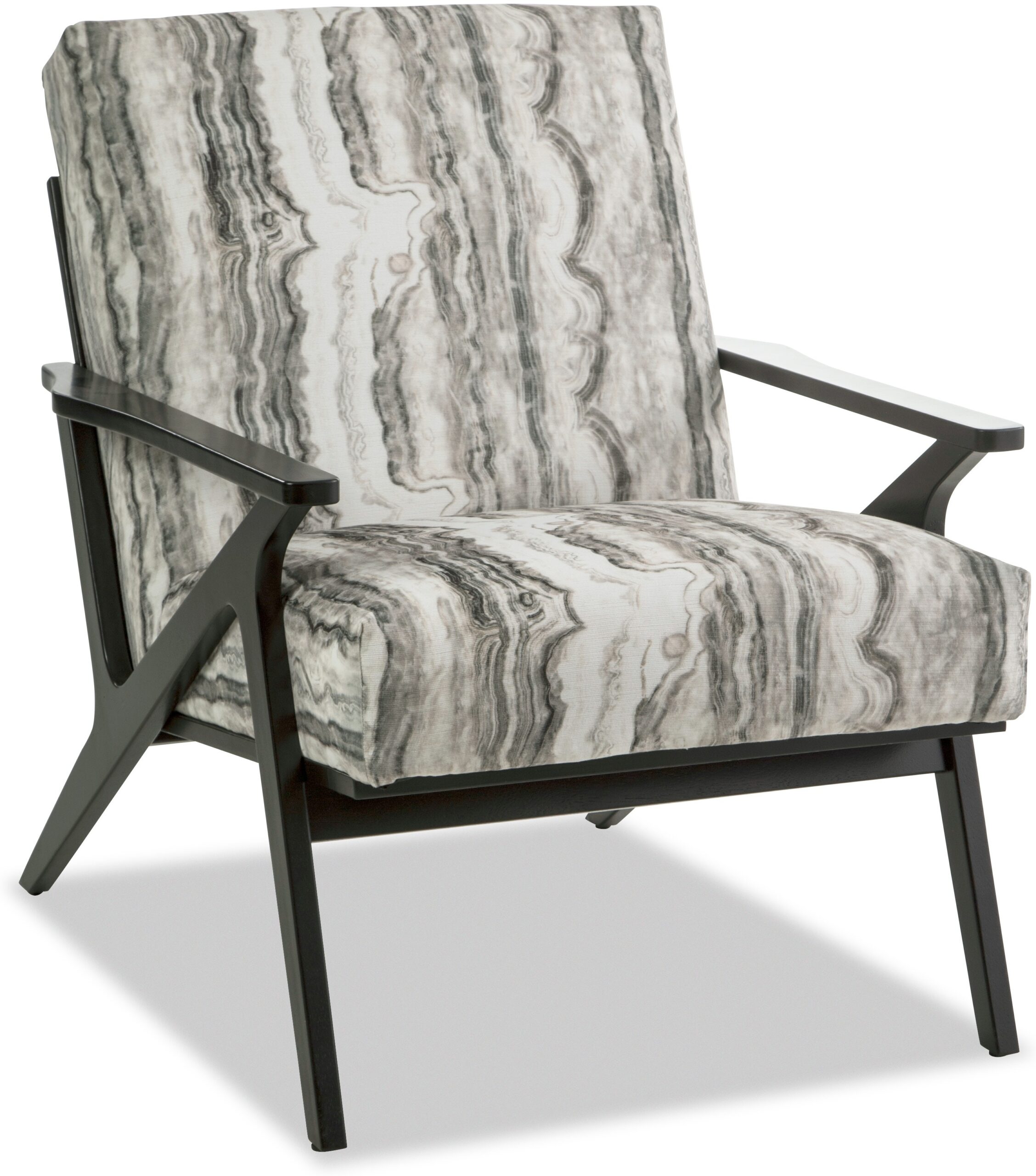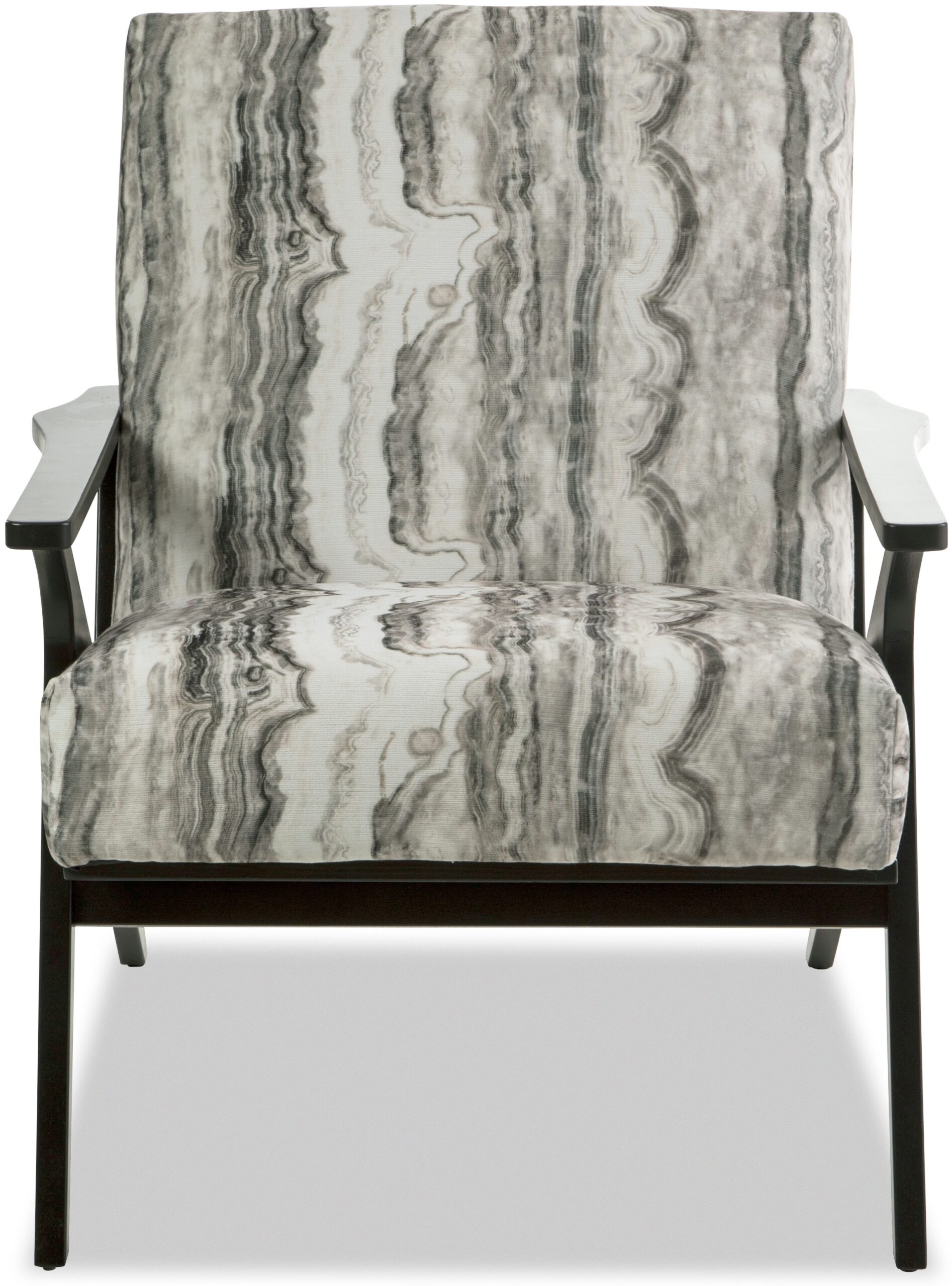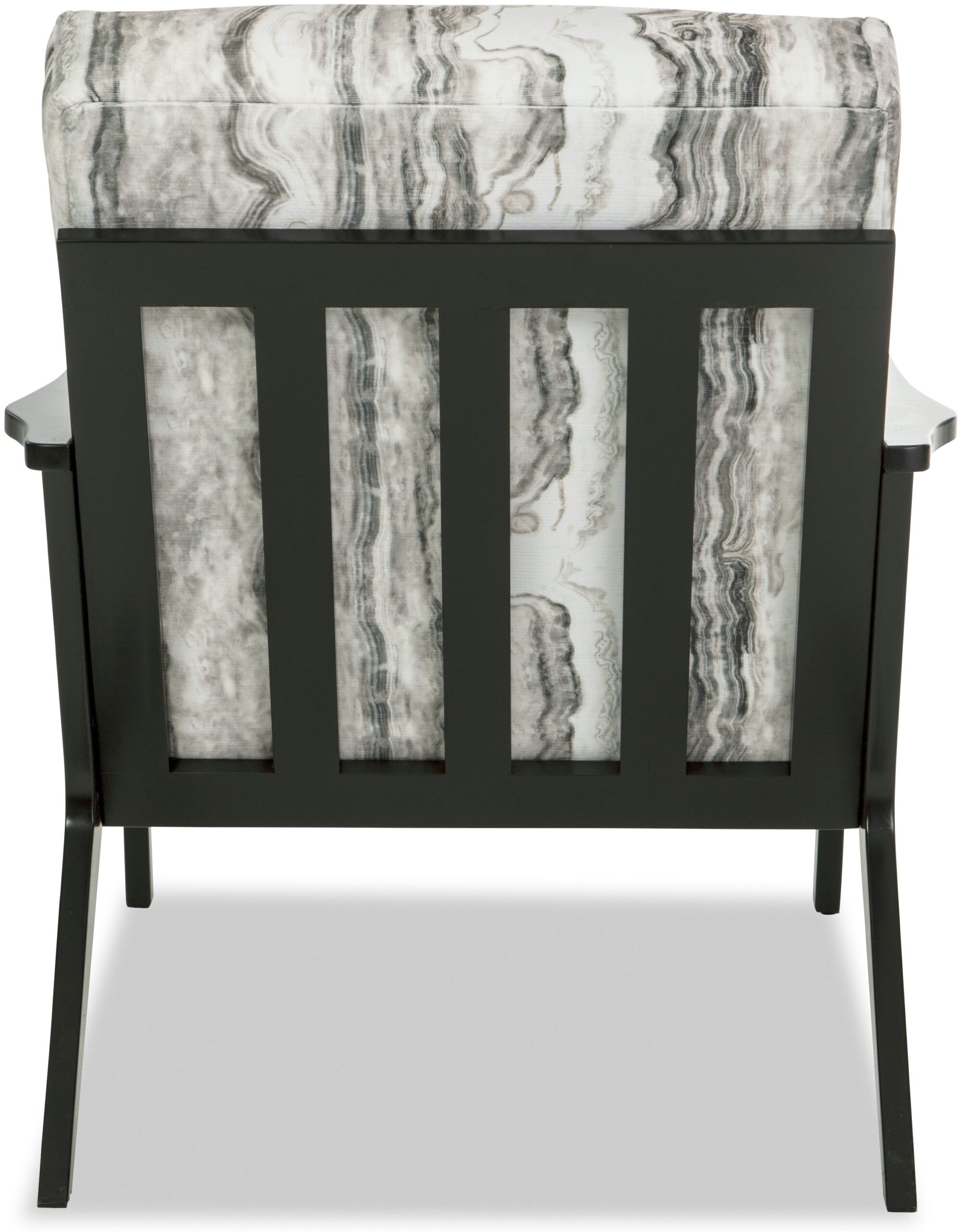 Clean lines with a nod to mid century modern styling make this chair a stand-out. It features an angular wood frame with a tight seat and back. Back of chair has vertical wood slats.