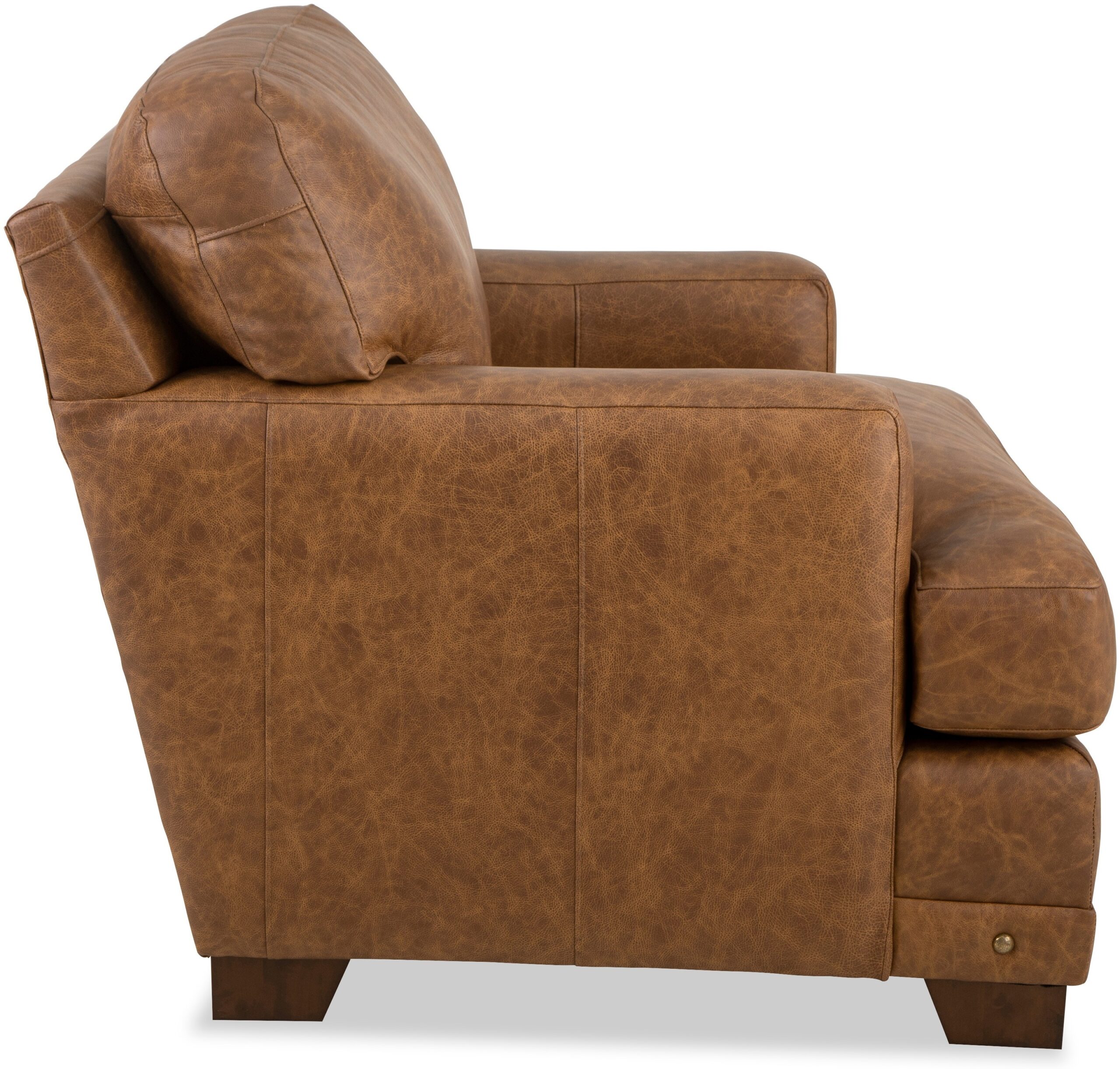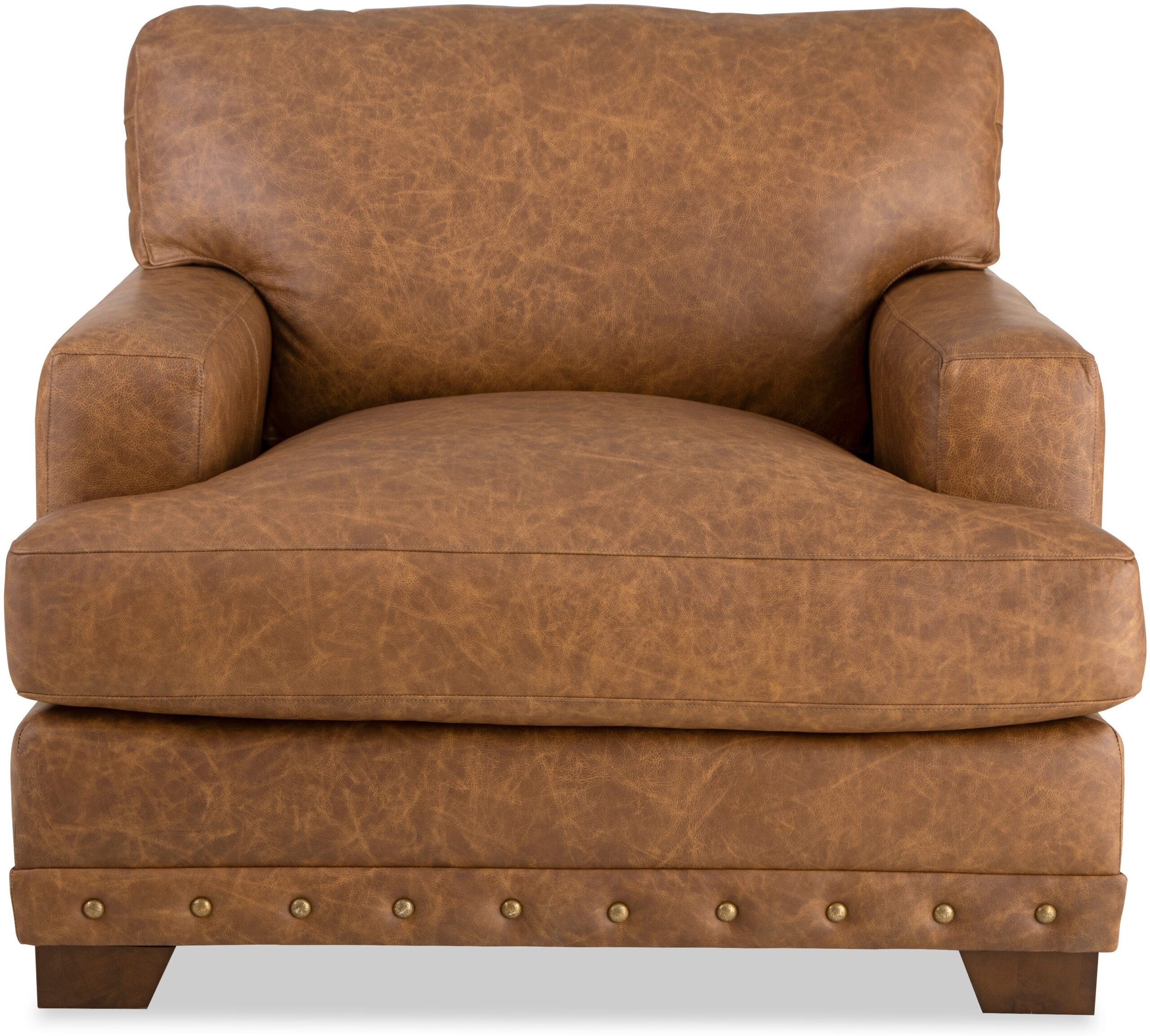 With architectural shaping and bold nail head detailing, this leather chair and a half has a casual appeal as well as amazing comfort. Deep seated, and generously scaled, there is plenty of room to relax. It features semi-attached backs, Blend Down Coil cushions, and track arms. Also available are the matching sofa, loveseat, and ottoman. Also available without nail head trim.