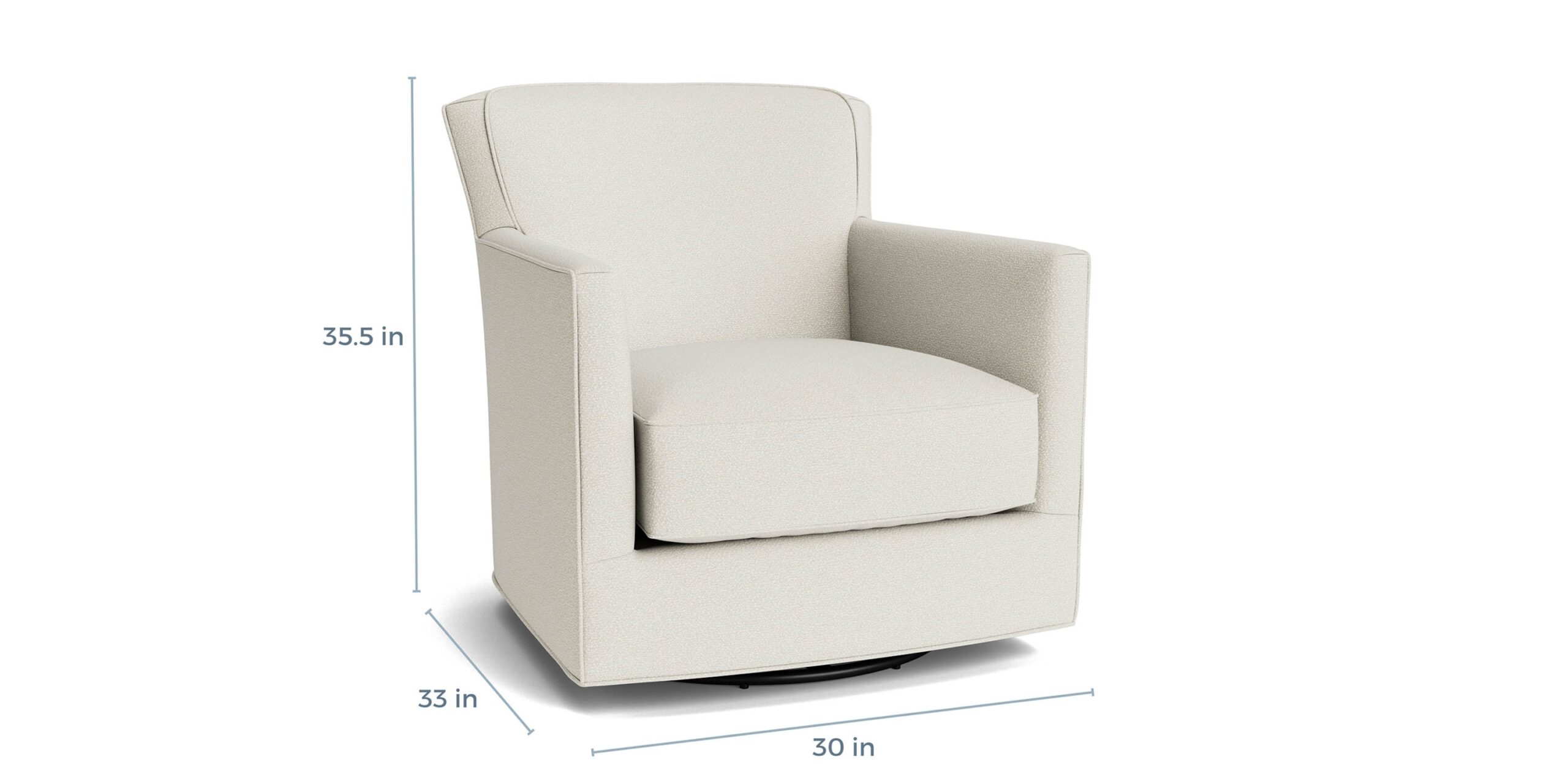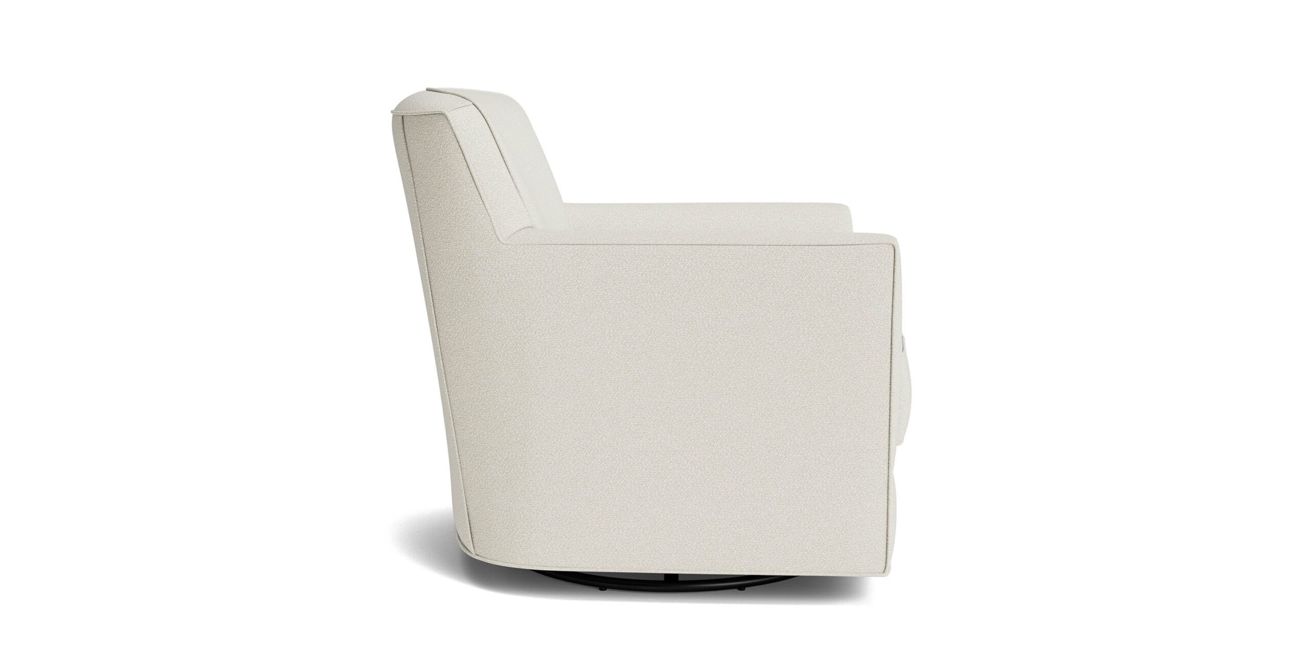 Enjoy both simple, sophisticated beauty and fine design in motion! Ease back in perfect relaxation with this New American Living Thin Track Arm Swivel Glider Chair by Bassett Furniture. Perfect for many lifestyles in a sitting room, bedroom, living room, den, or nursery. This comfy swivel glider features a padded back and a boxed, welted seat cushion. Also available in leather.