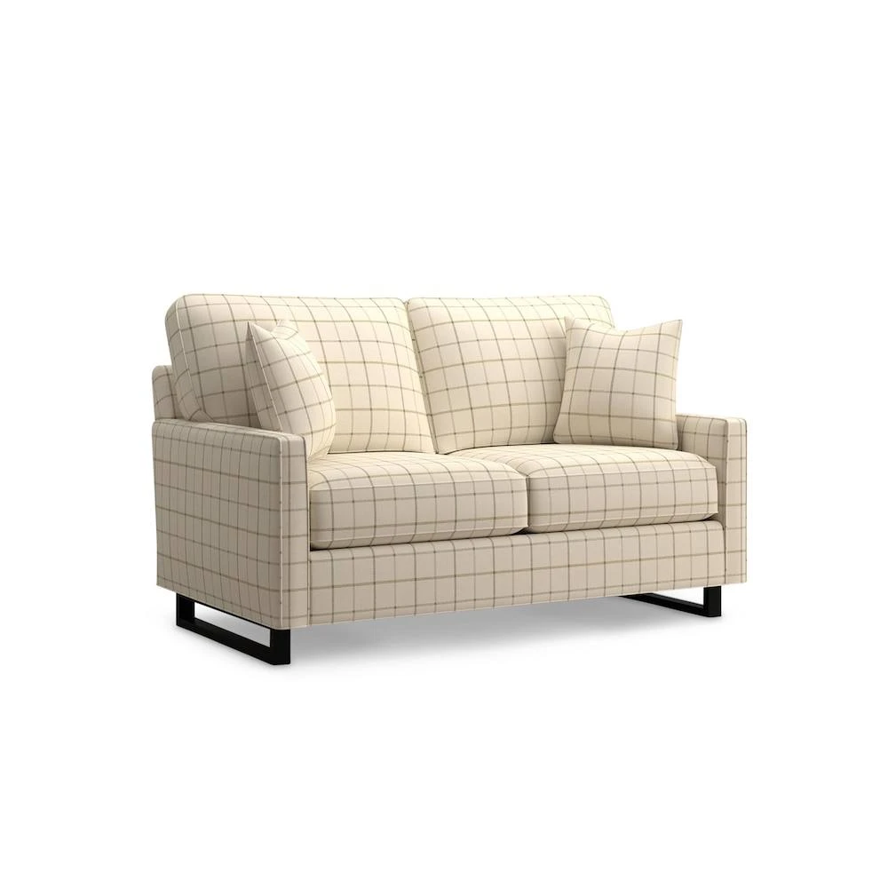This trim 2/2 sofa adds a touch of refined, country casual and modern, upholstered in Woven Plaid Cream fabric with matching arm pillows and stands on modern, exposed wood, Plinth legs. This sofa also features comfortable track arms and a loose box back.