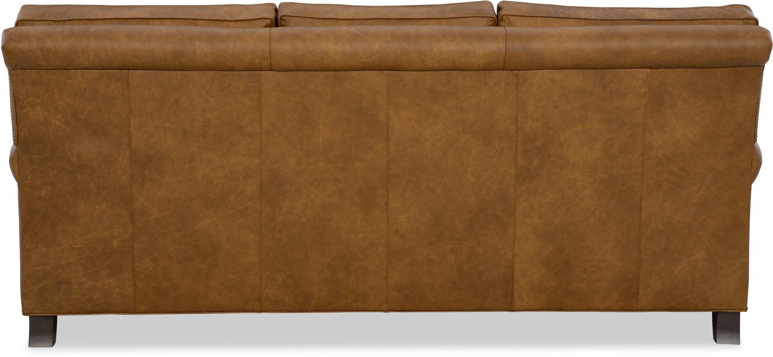 Classic traditional details and nail head trim accents are the things you’ll notice first on this gracefully finessed leather sofa. It features a rollover back, cut-back rolled arms, and beautifully turned legs that offer a familiar heirloom touch. Attached box border back pillows and Blend Down Coil Seat Cushions. Optional nail finishes available. Also available are the matching loveseat, chair 1/2, and ottoman. Also available without nail head trim.