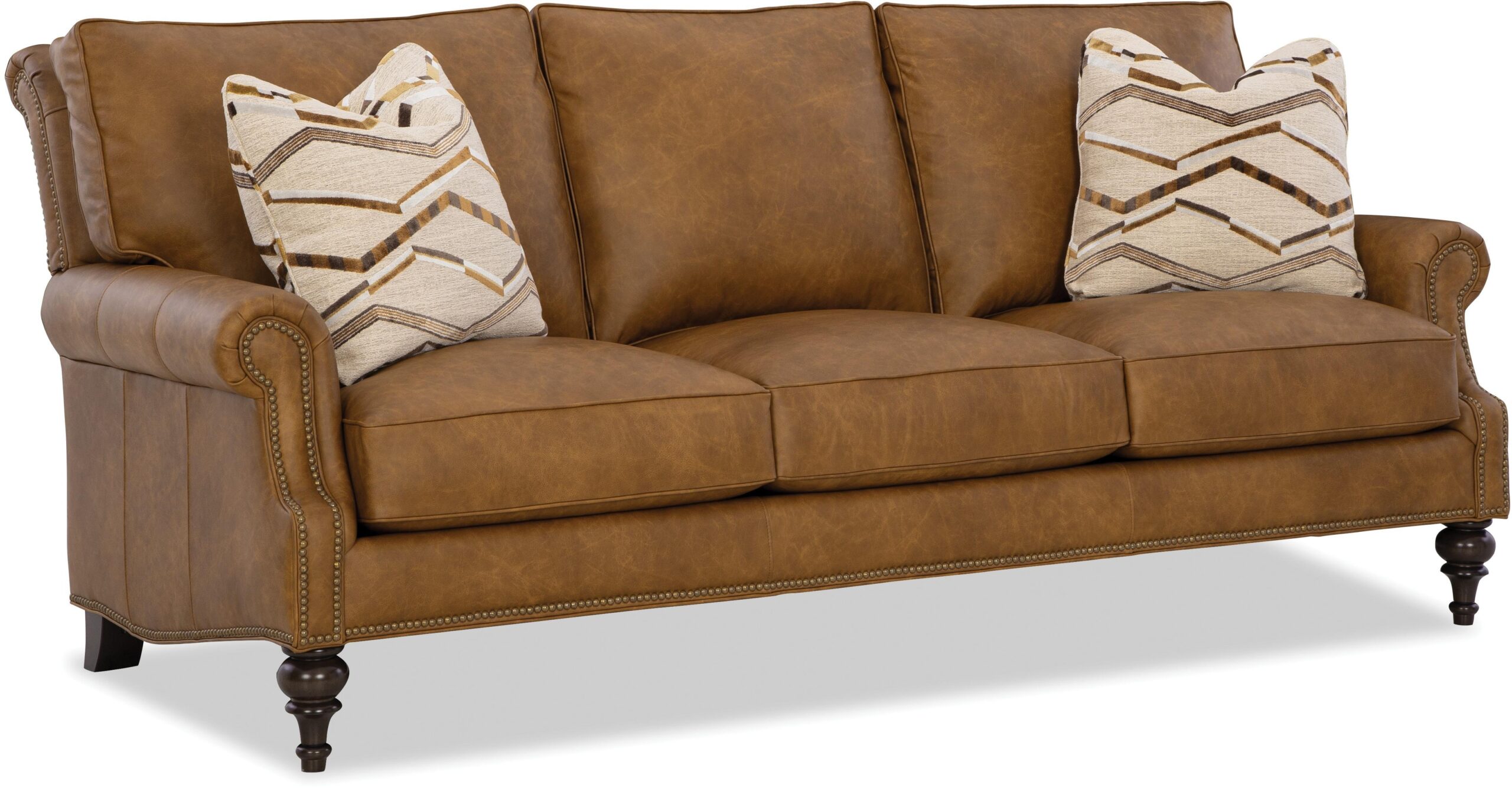 Classic traditional details and nail head trim accents are the things you’ll notice first on this gracefully finessed leather sofa. It features a rollover back, cut-back rolled arms, and beautifully turned legs that offer a familiar heirloom touch. Attached box border back pillows and Blend Down Coil Seat Cushions. This style is standard with one pair of LuxDown toss pillows in your choice of fabric. Optional nail finishes available. Also available are the matching loveseat, chair 1/2, and ottoman. Also available without nail head trim.