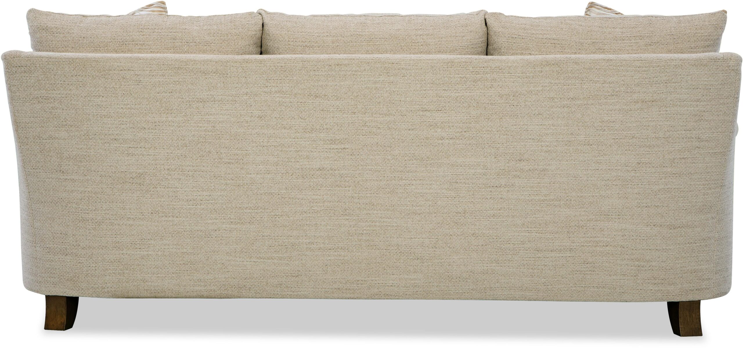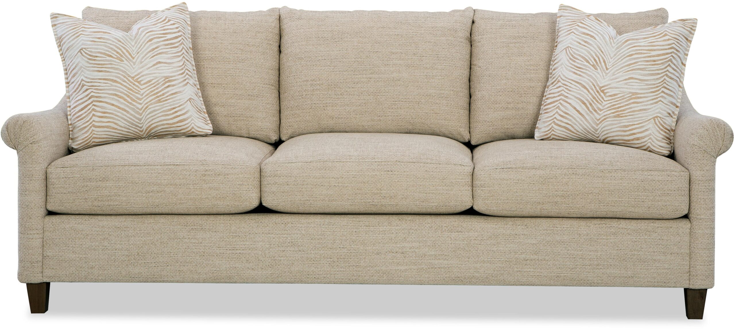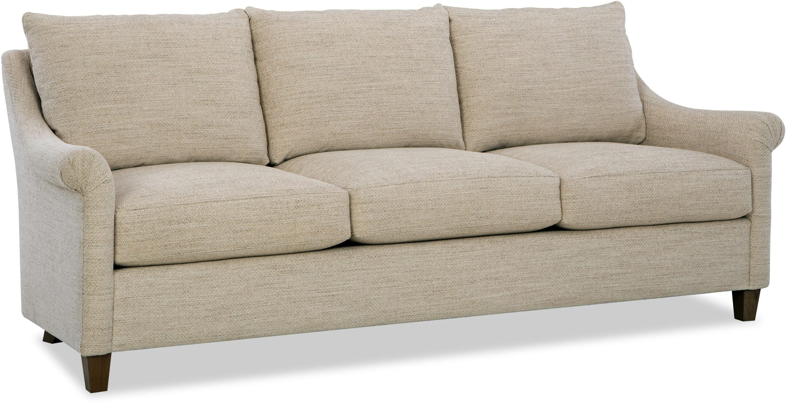 Understated and elegant, this sofa is beauty defined. It features slender sloping arms that taper from back to front and is finished with a pleated detail on the face. French seamed overall with knife-edge bed-pillow style back pillows. Blend Down seat cushion and flanged Blend Down toss pillows. Tapered legs. Also available are the matching loveseat, chair and ottoman.