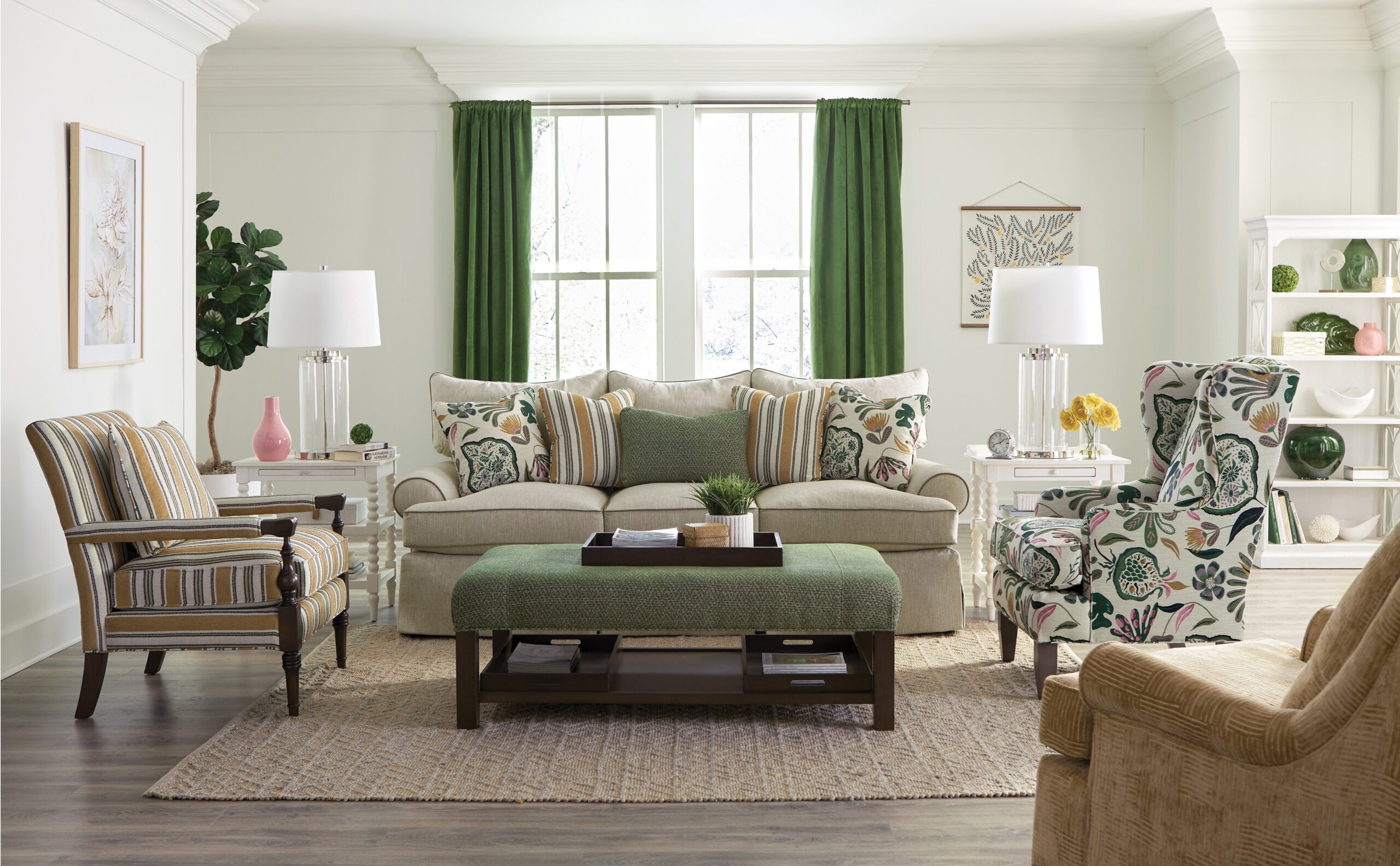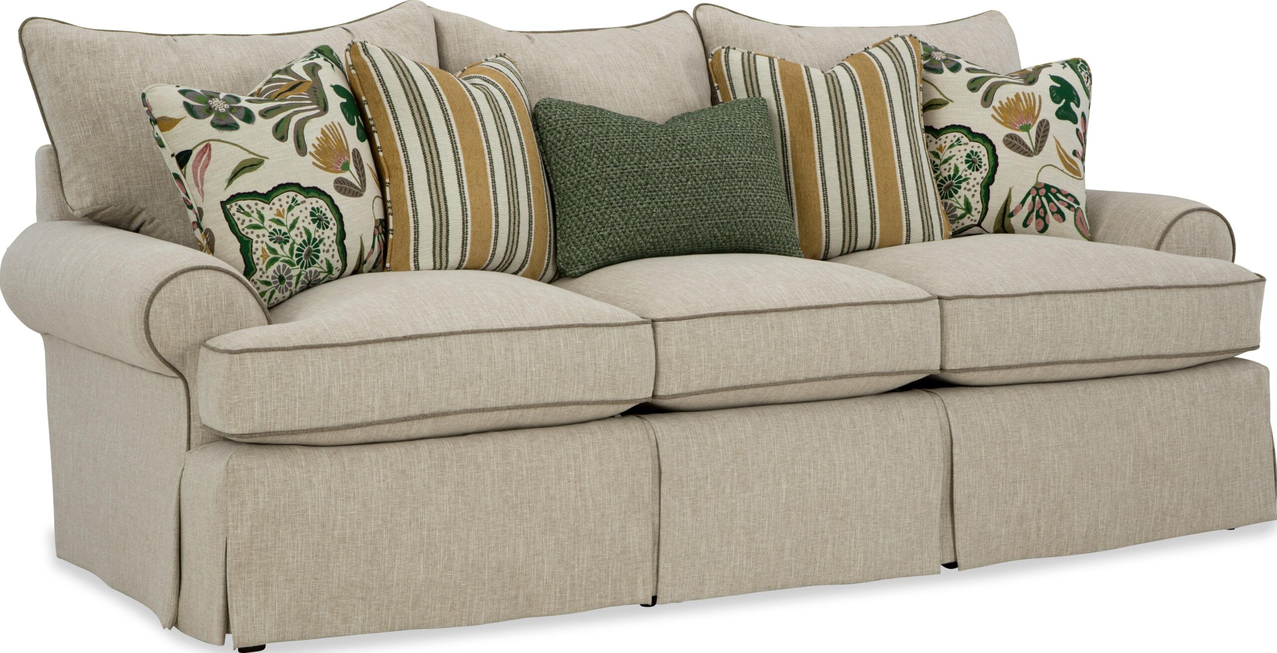 It’s easy to make room for everyone on this 100” sofa from the Paula Deen Home collection! This sofa is our best seller, and you can see why. It’s built for comfort, with 3 plush loose pillow backs, 5 accent pillows, and Paula’s exclusive Down Blend seat cushions. This style features sock arms, a high waterfall skirt and all the comforts of home! Also available are the matching loveseat, chair 1/2, and ottoman.