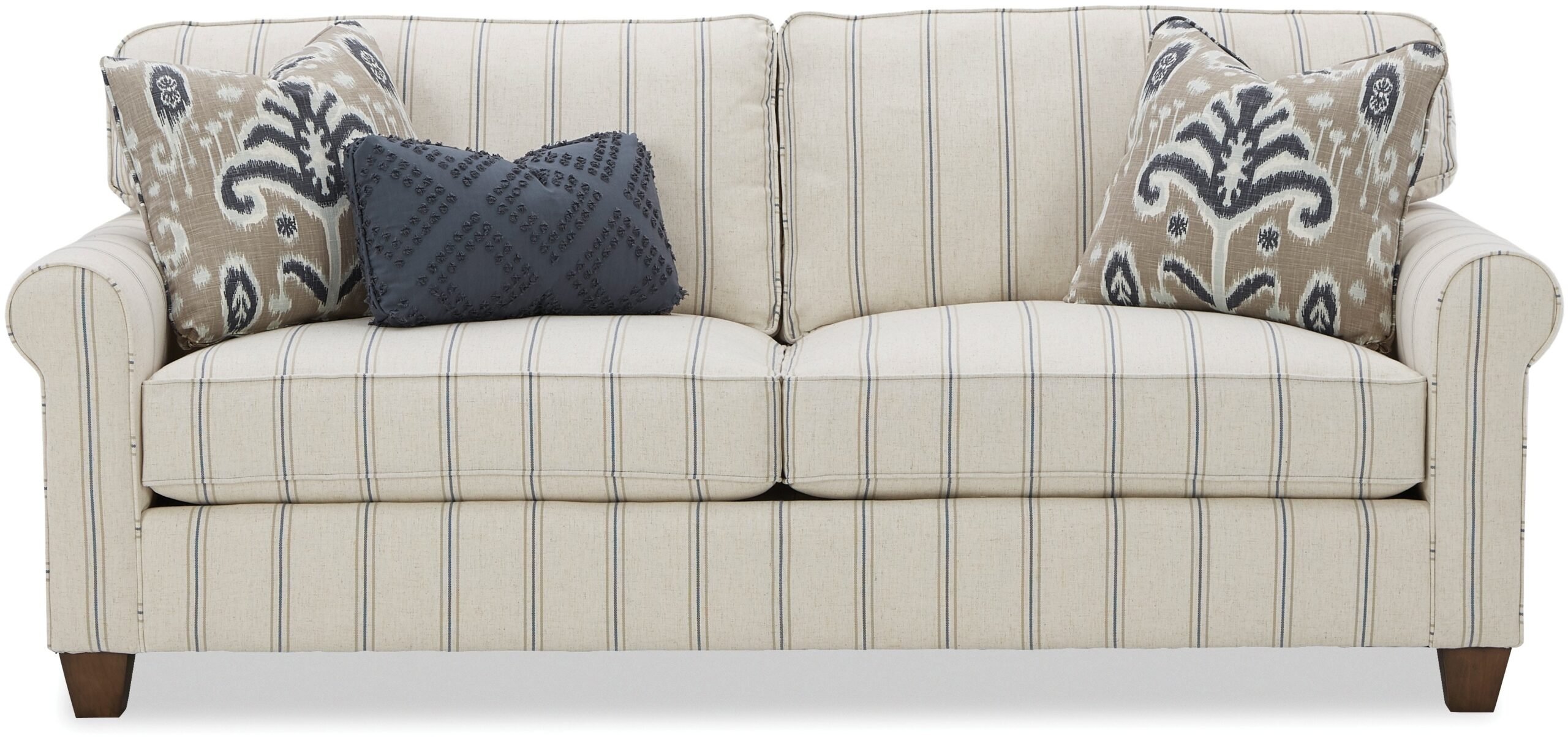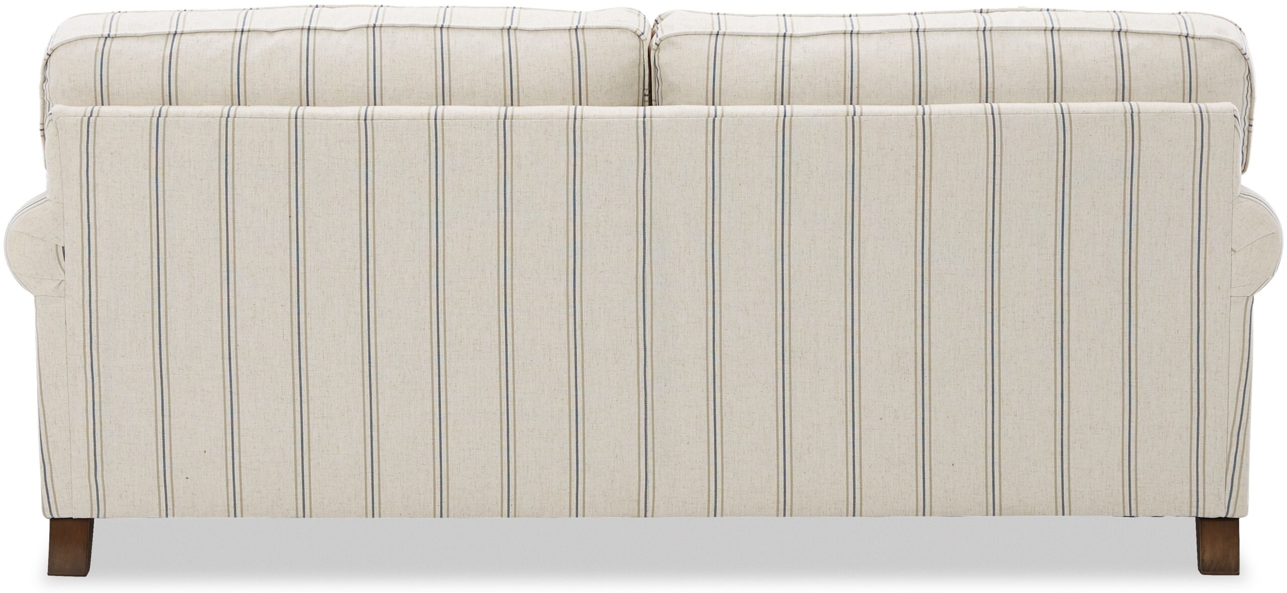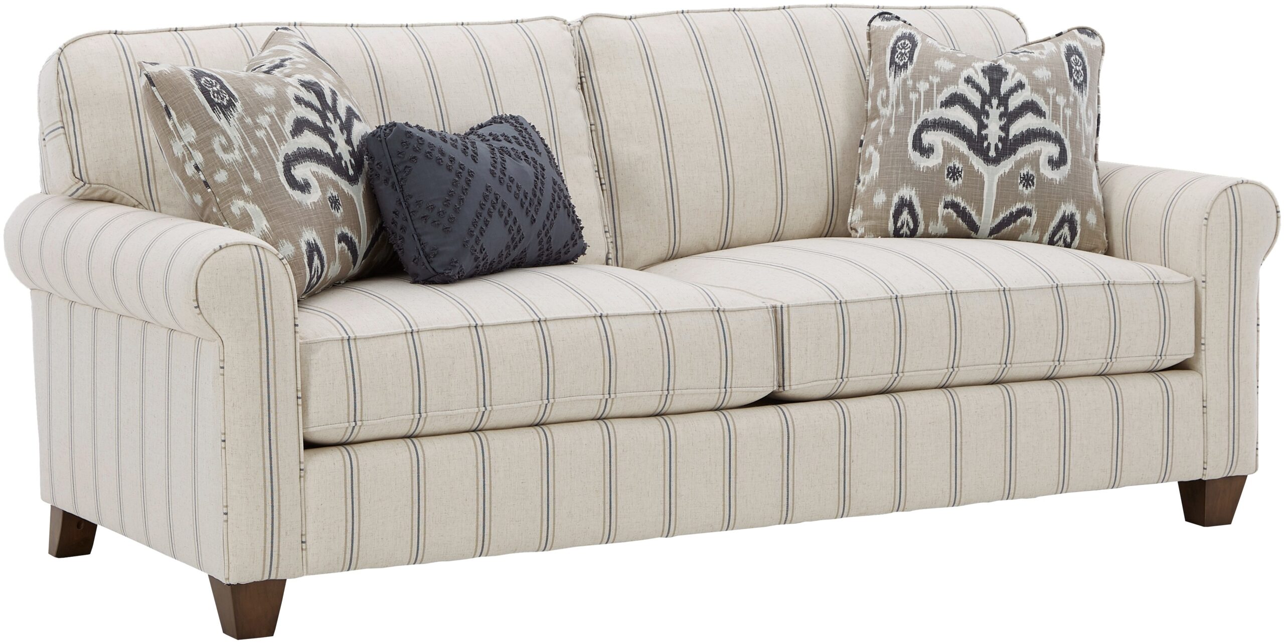 Tradition and Today blend together seamlessly in this classic sofa style. It features loose box border backs and plush Super Soft Blend Down seat cushions and backs for extraordinary comfort, as well as two Luxdown toss pillows and one kidney pillow for a welcoming touch. Sock arms and tapered legs compete the familiar, pulled- together look of this beautifully tailored sofa. Also available as a 3 seat style using style number 717450BD. Also available – matching sleeper, loveseat, chair and ottoman. Also available as a sectional.