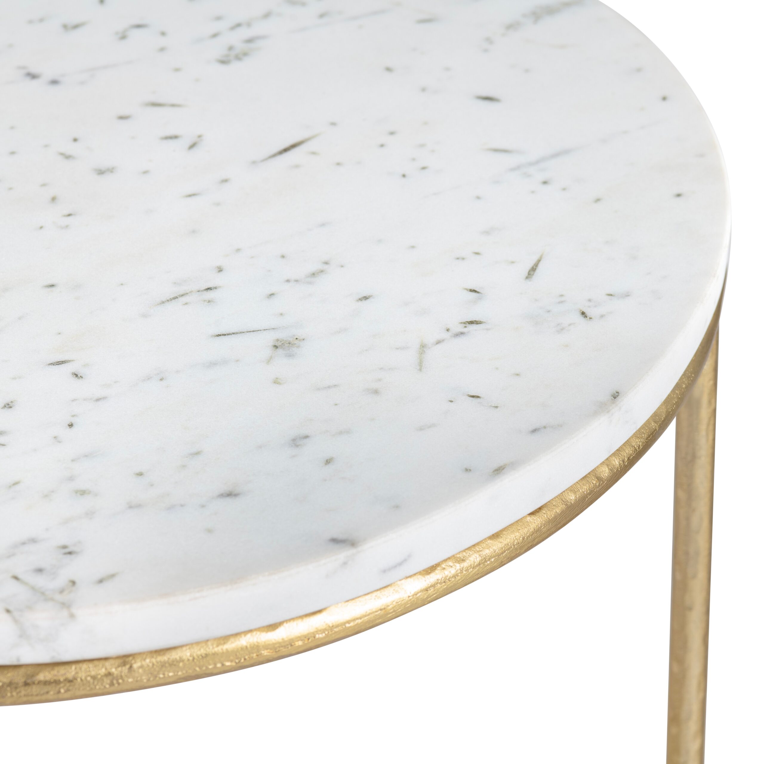 Picture this: three gleaming gold metal legs, ready to take center stage. Their contemporary flair is matched only by the smooth, round white marble top, creating a stunning contrast that’s as stylish as it is fun. But here’s the twist – there are two tab
