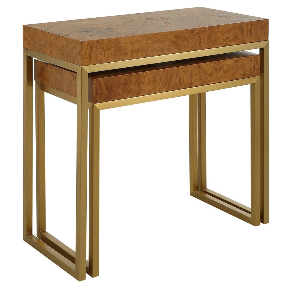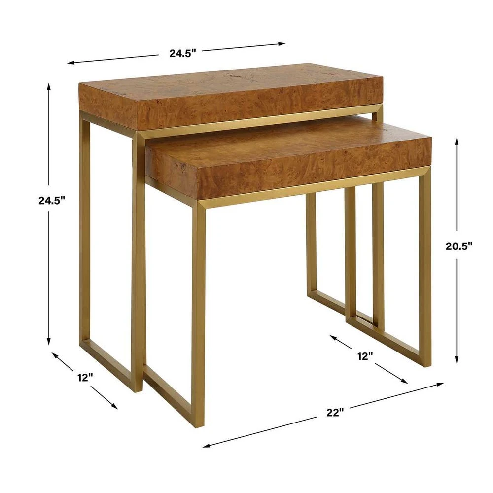 Timeless yet modern, the Burl-esque Nesting Tables feature mappa burl veneer in rich pecan with subtle sheen. The streamlined bases pair beautifully in brushed brass stainless steel.